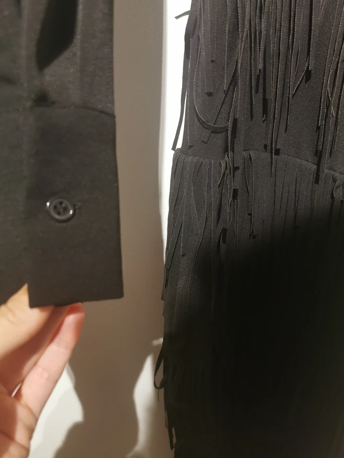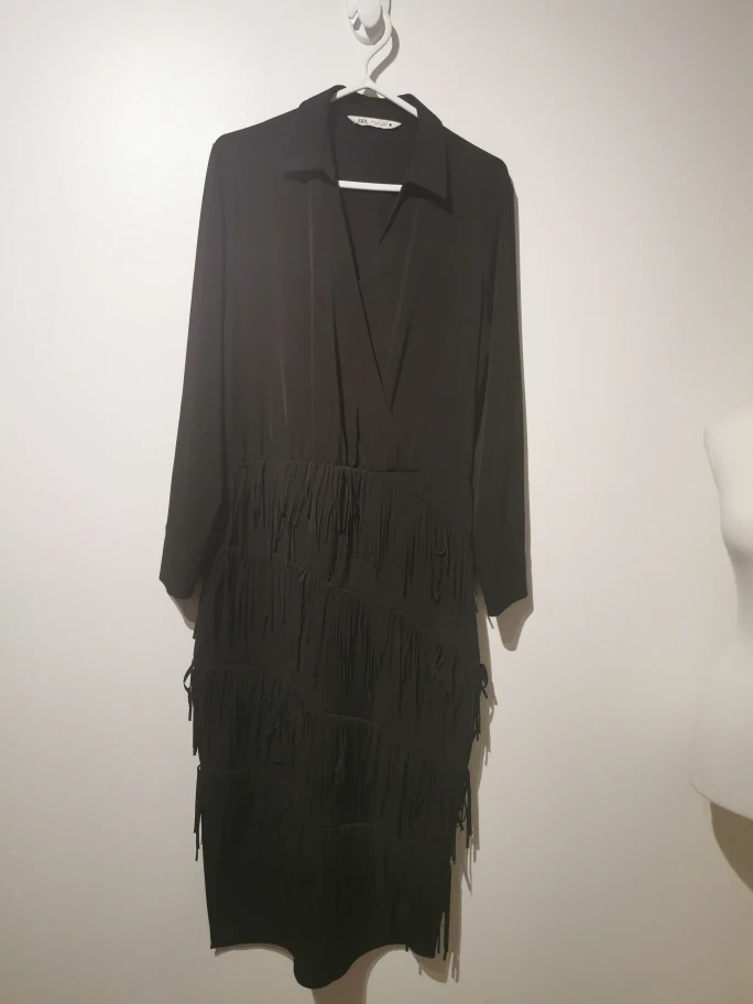 Selling a Zara black tassel dress in size large ! It features a stylish fringe design and long sleeves. Perfect for a night out or a special occasion. The material is comfortable and the dress is in great condition!