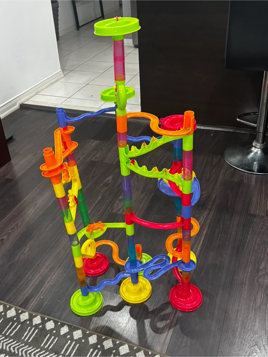 This is a large, colourful marble run toy. It's made of plastic and includes many tubes and ramps for the marbles to travel down. Assembly is required, but it offers hours of fun watching the marbles race!