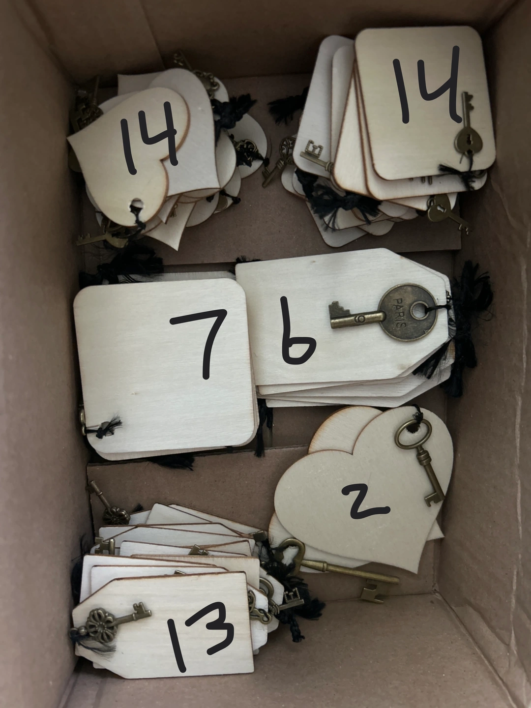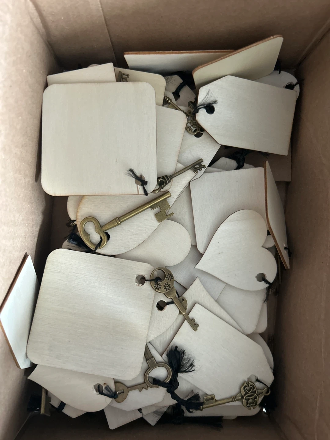 A bulk lot of unfinished wooden tags, some square and some heart-shaped. Each tag has a small hole and is attached with twine to a decorative brass-toned key charm. These are great for crafting projects or personalized gift tags!