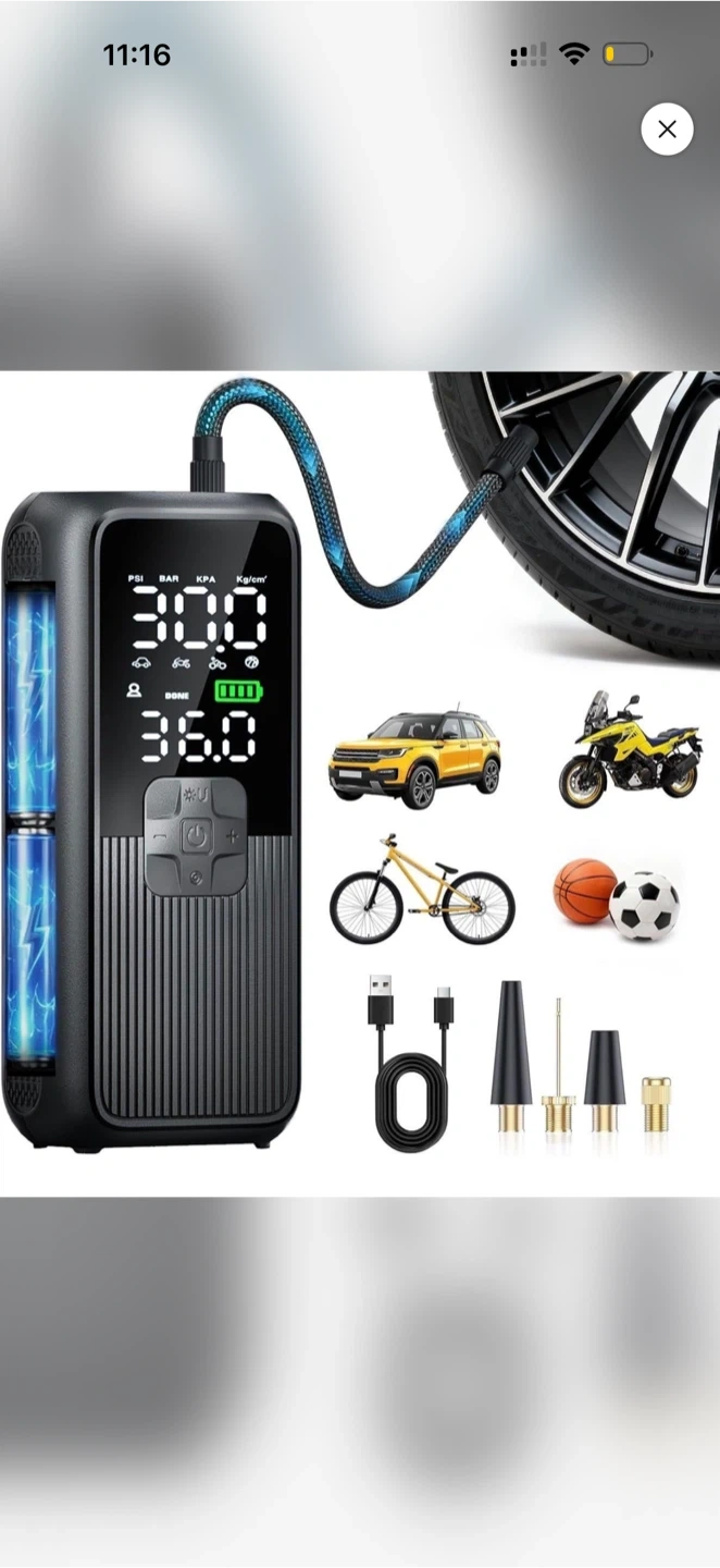 This portable digital air compressor is perfect for cars, motorcycles, bikes, and sports balls. It comes with a USB charging cable and multiple nozzle adapters. The digital display shows pressure in PSI, BAR, KPA, and Kg/cm². It's rechargeable and easy to use for on-the-go inflation needs!