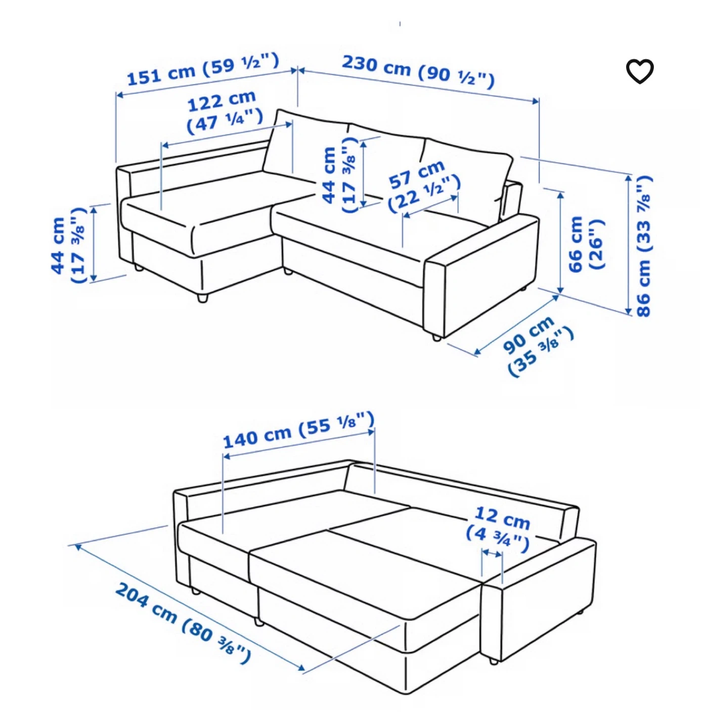 This grey sectional sofa offers convenient storage and converts into a bed. Its dimensions are 230 cm wide and 151 cm deep for the main section, with a bed size of 204 cm by 140 cm. It's great for maximizing space in smaller living areas!