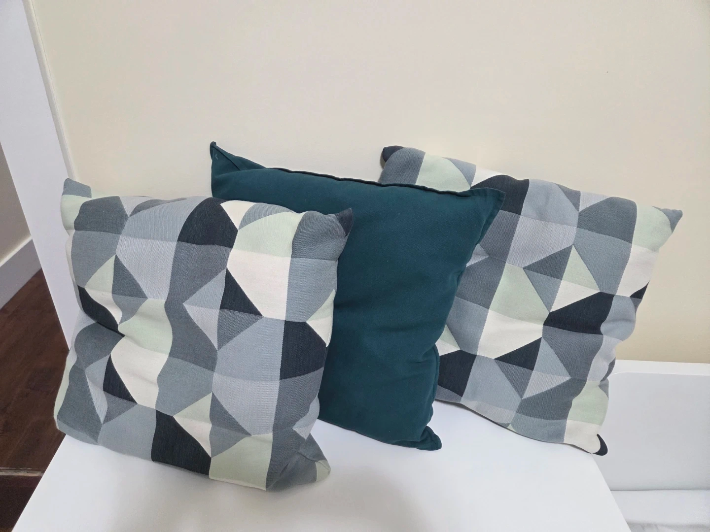 This set includes three throw pillows. Two feature a grey, black, and white geometric pattern, and one is a solid teal colour. They're great for adding a pop of colour and comfort to any sofa or chair!