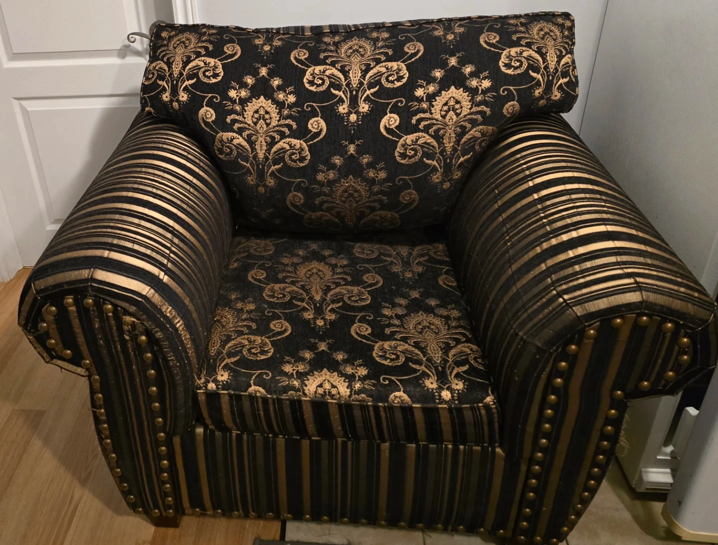 Stylish three-seater sofa featuring a black damask pattern with gold accents. Upholstered in a textured fabric with striped detailing on the arms and base. Includes decorative throw pillow with matching pattern.