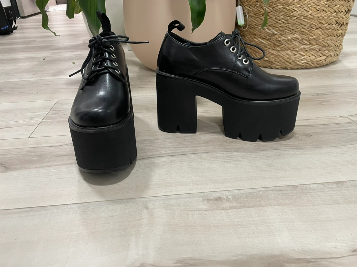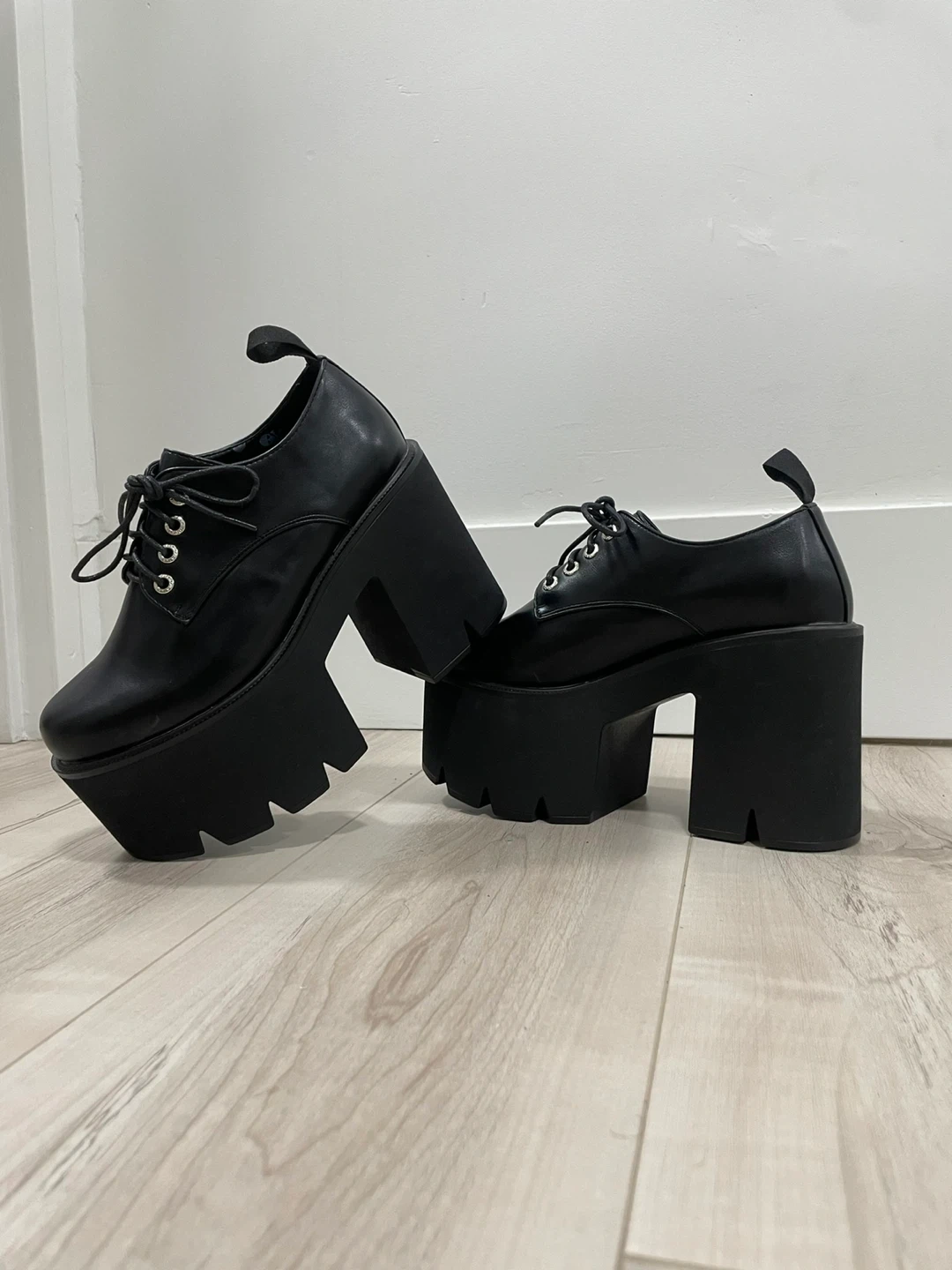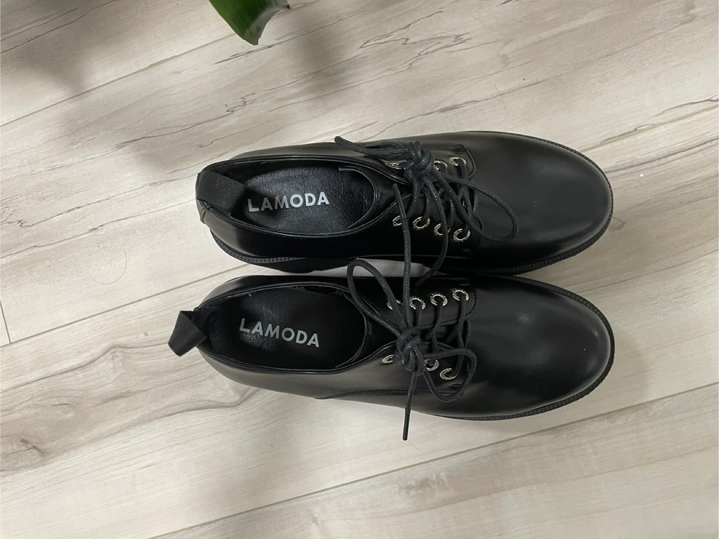 LAMODA black platform oxford shoes. These have a chunky heel and lace-up closure. They're made with a faux leather material and have a lug sole.