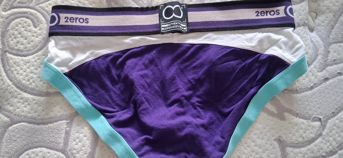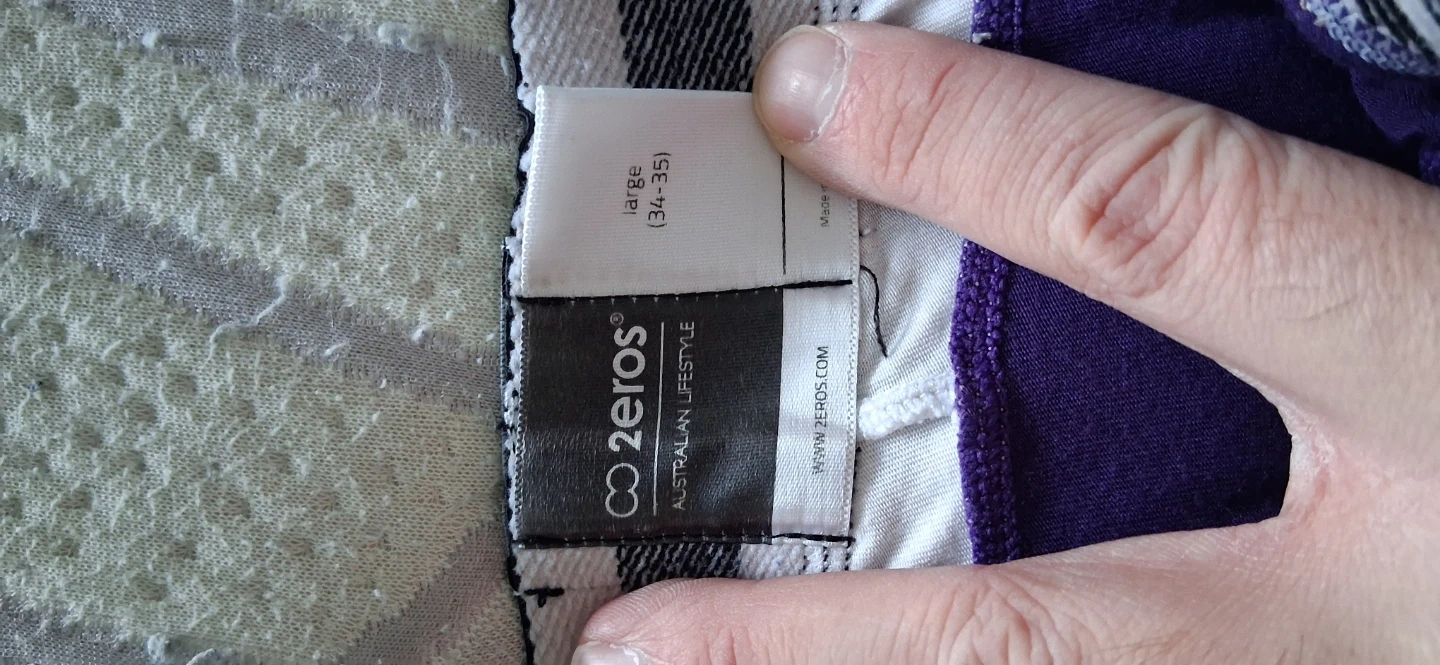These are 2eros briefs made for Australian Lifestyle. They're a size large, fitting waist sizes 34-35 inches. The fabric's a blend, and it's primarily purple with white and light blue trim.never worn just sat in storage.