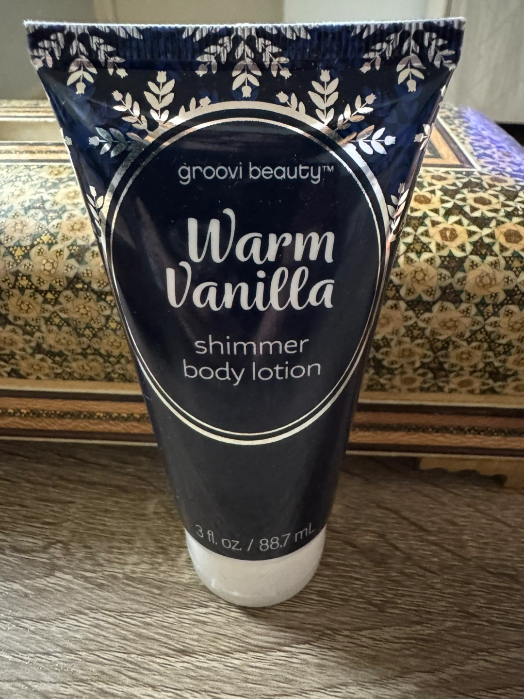 This is Groovi Beauty's Warm Vanilla shimmer body lotion. It comes in a 3 fl. oz. / 88.7 mL bottle. The lotion adds a subtle shimmer to your skin.