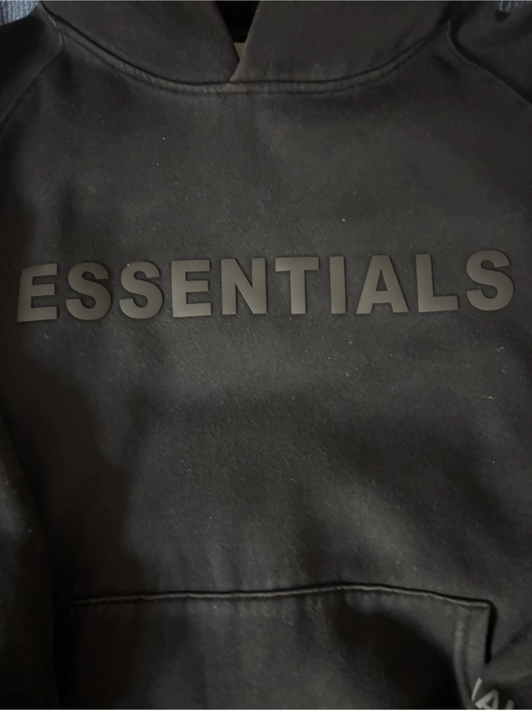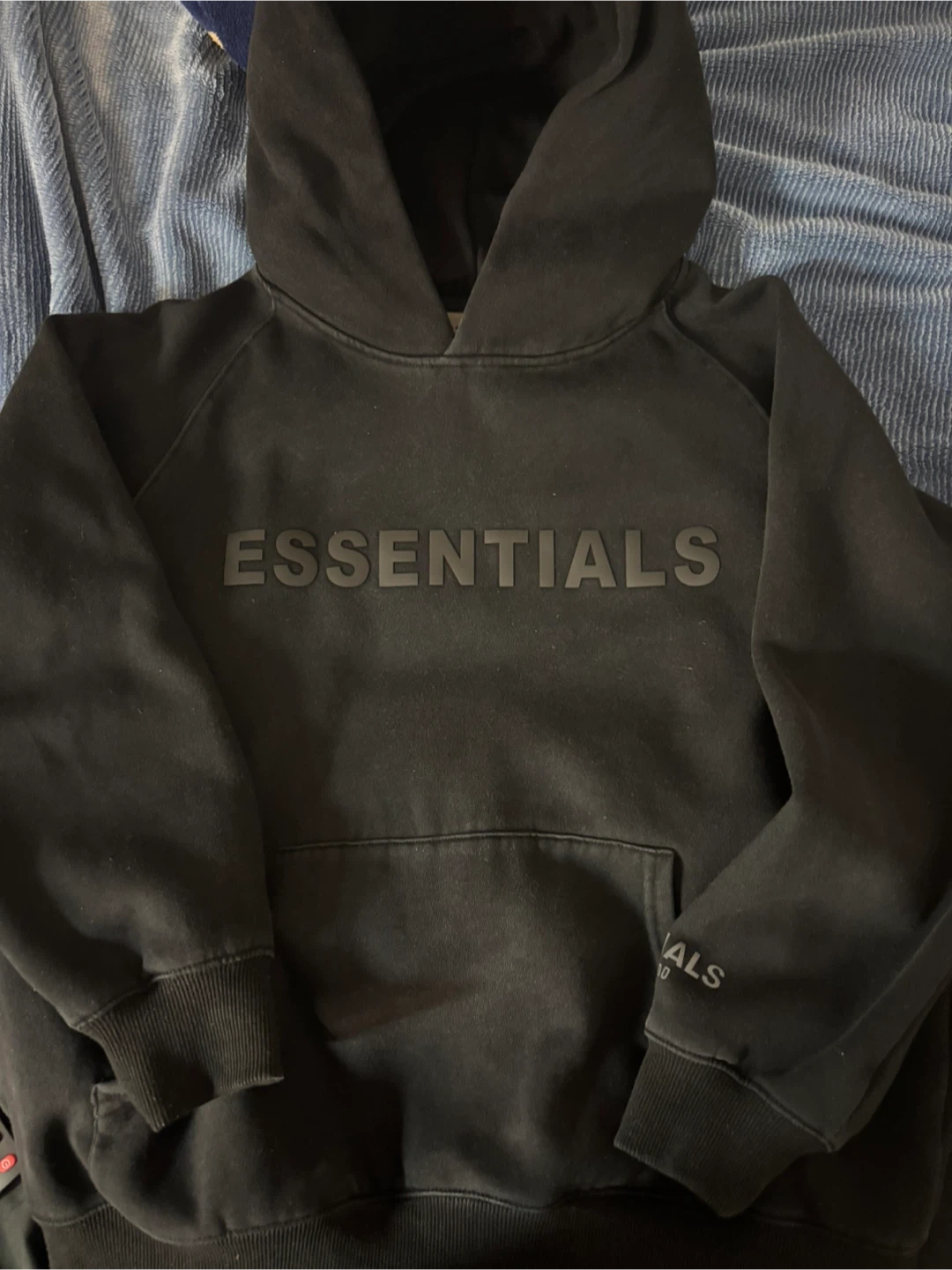 This is a black Fear of God Essentials hoodie. It's made of a soft cotton blend. This hoodie is great for everyday wear.