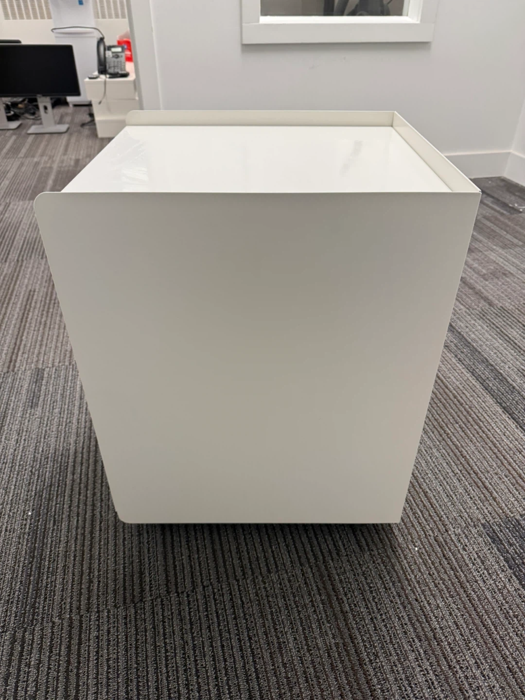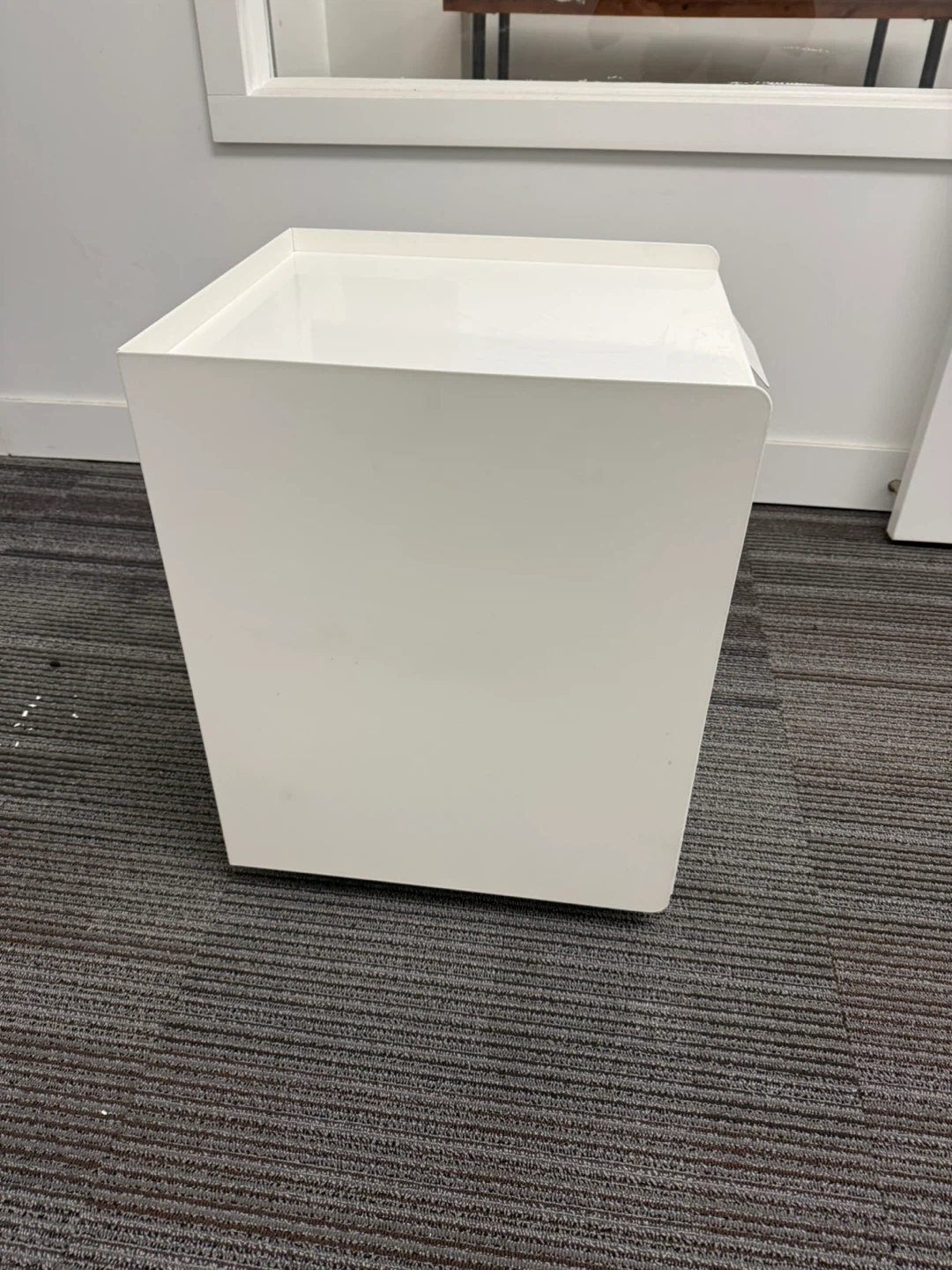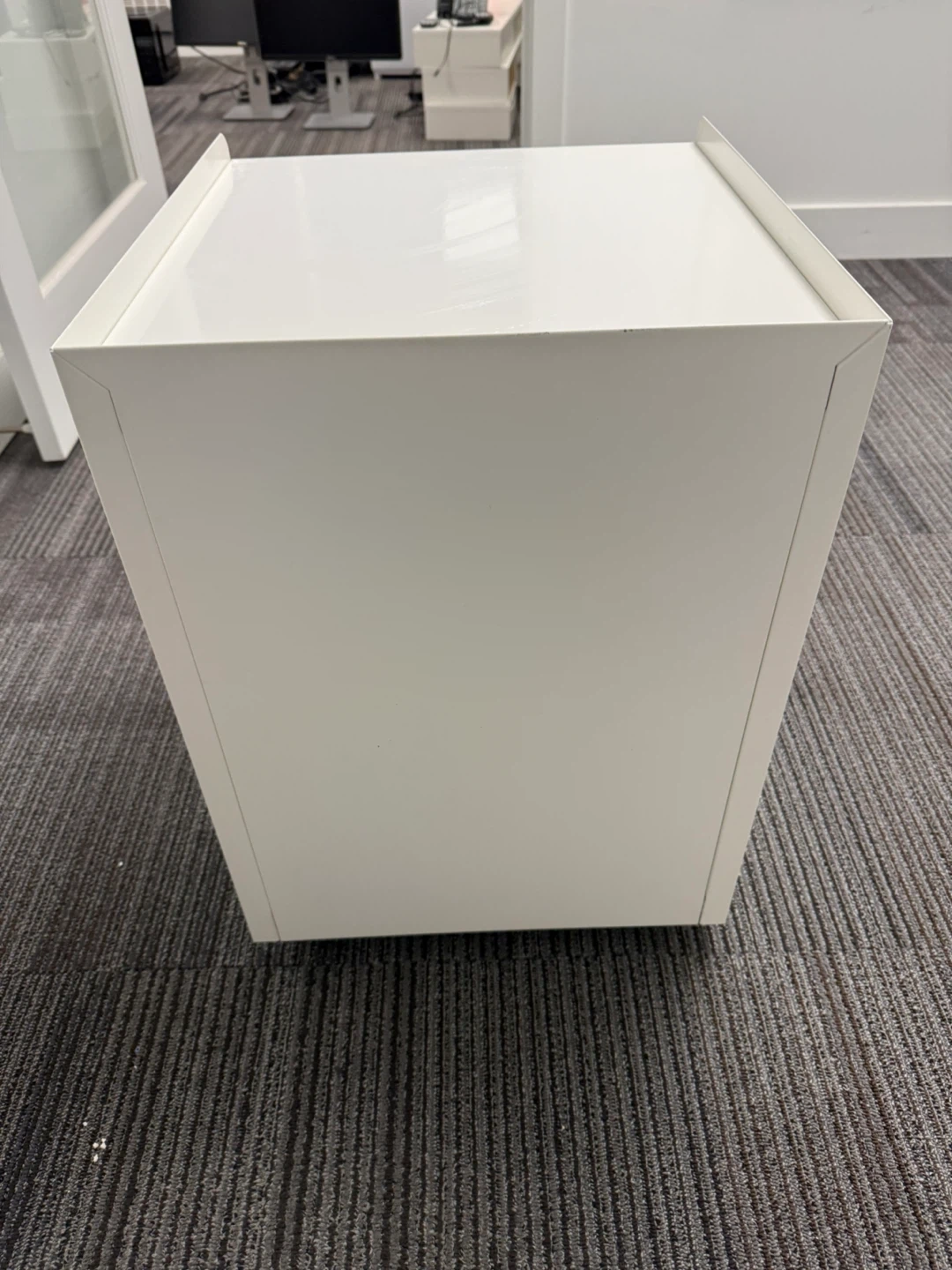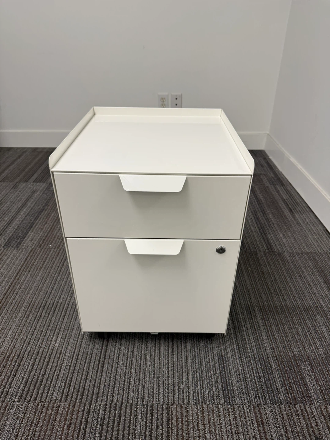 White 2-drawer filing cabinet made of metal and has wheels. It's great for organizing office papers and supplies. The drawers slide smoothly. Perfect for small offices or home workspaces!
