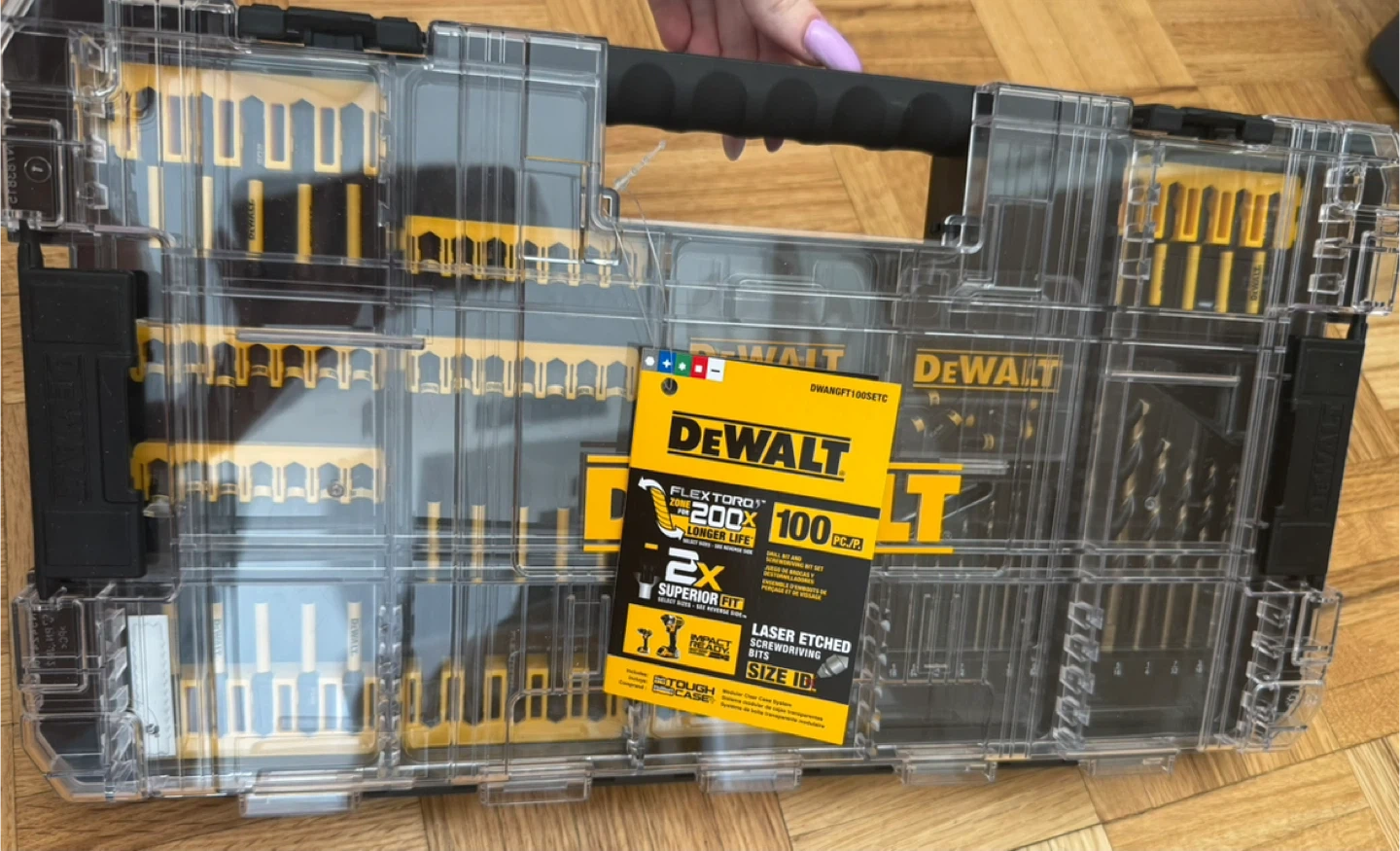 Includes a wide variety of drill bits, driver bits, nut drivers, and extensions — perfect for home renovations, furniture assembly, woodworking. The set comes in a durable, clear plastic case with a handle for easy transport.