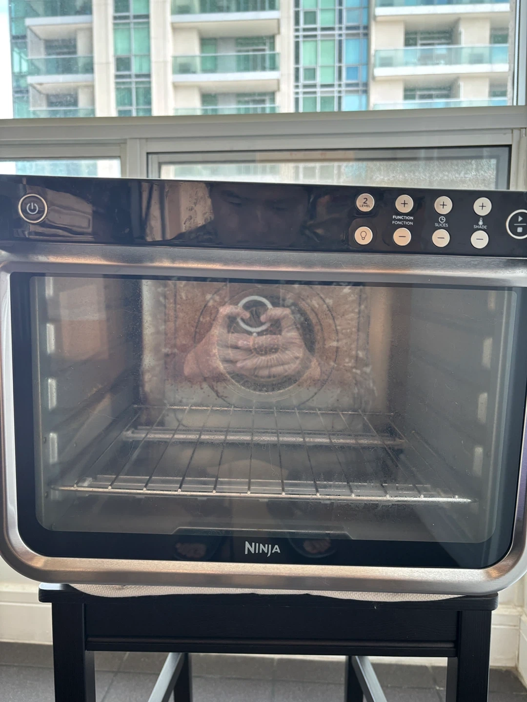 It's a Ninja brand air fryer toaster oven. Stainless steel interior and digital display. Includes wire rack and crumb tray.
