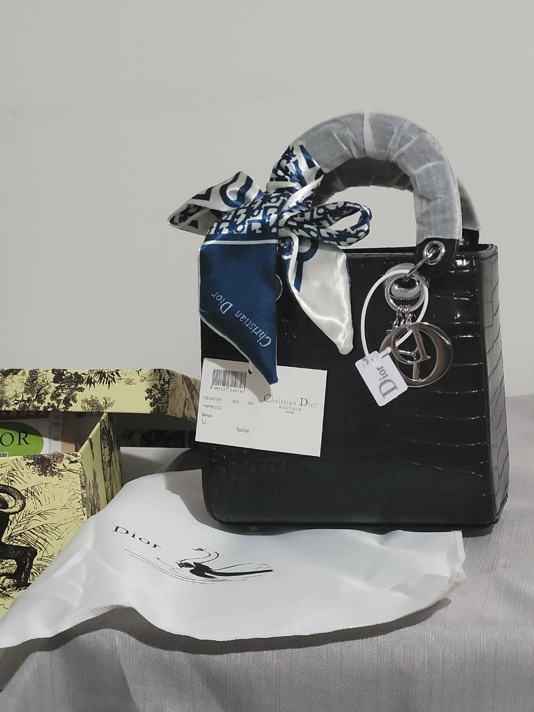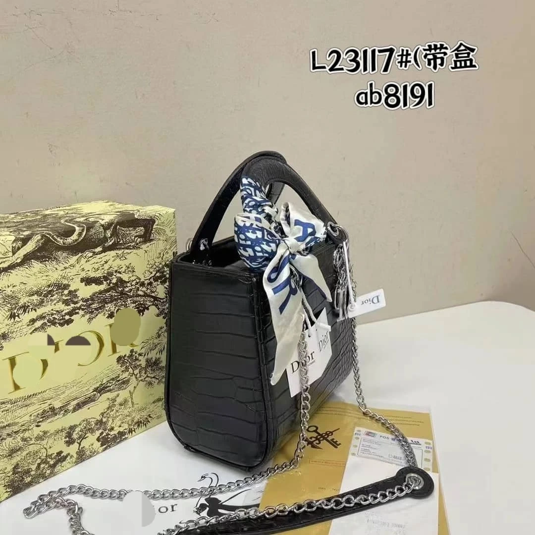 Christian Dior Lady Dior handbag in black. It's a structured tote with a crocodile-embossed finish. Includes original packaging and dust bag.