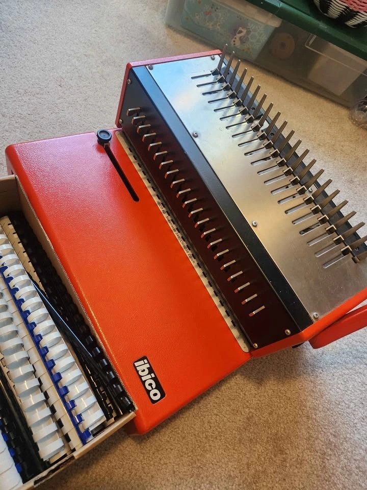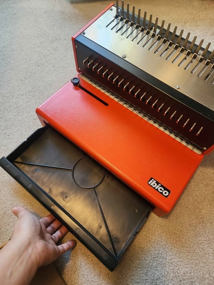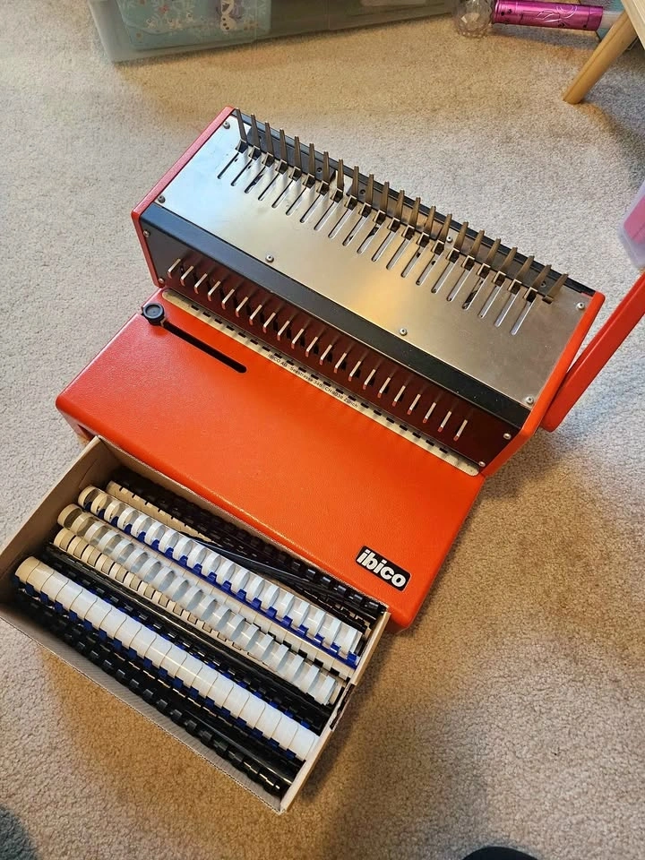 Professional-grade Ibico comb binding machine in excellent working condition. This is a solid, heavy-duty metal unit built for durability and precision—much more reliable than modern plastic versions. Perfect for creating professional presentations, reports, manuals, or school projects. Key Features: Heavy-Duty Construction: Solid metal body for stability and long-term use. Manual Punch & Bind: Easy-to-use handle for effortless punching and comb opening. Adjustable Margins: Includes a paper guide to ensure consistent hole alignment for various document sizes. Bonus Included: Comes with a box containing various sizes of black and white plastic binding spines so you can start organizing right away. Condition: used. Location: Grandview swimming pool. Everything has been well-maintained and works perfectly. Great for a home office, small business, or classroom setting.