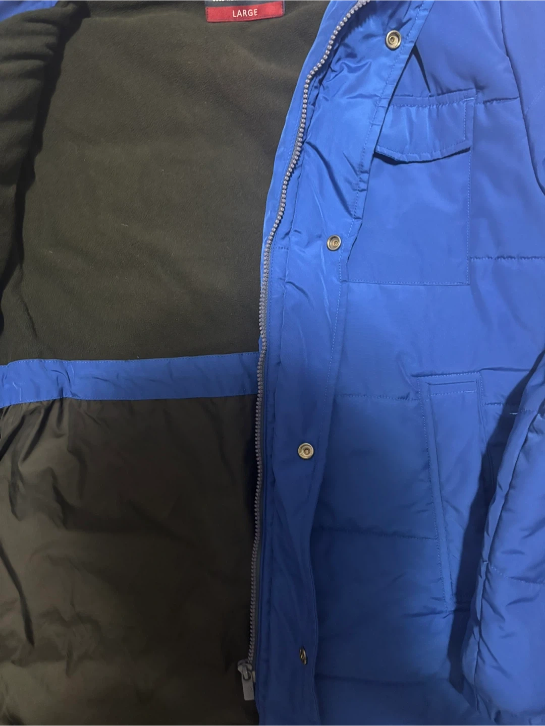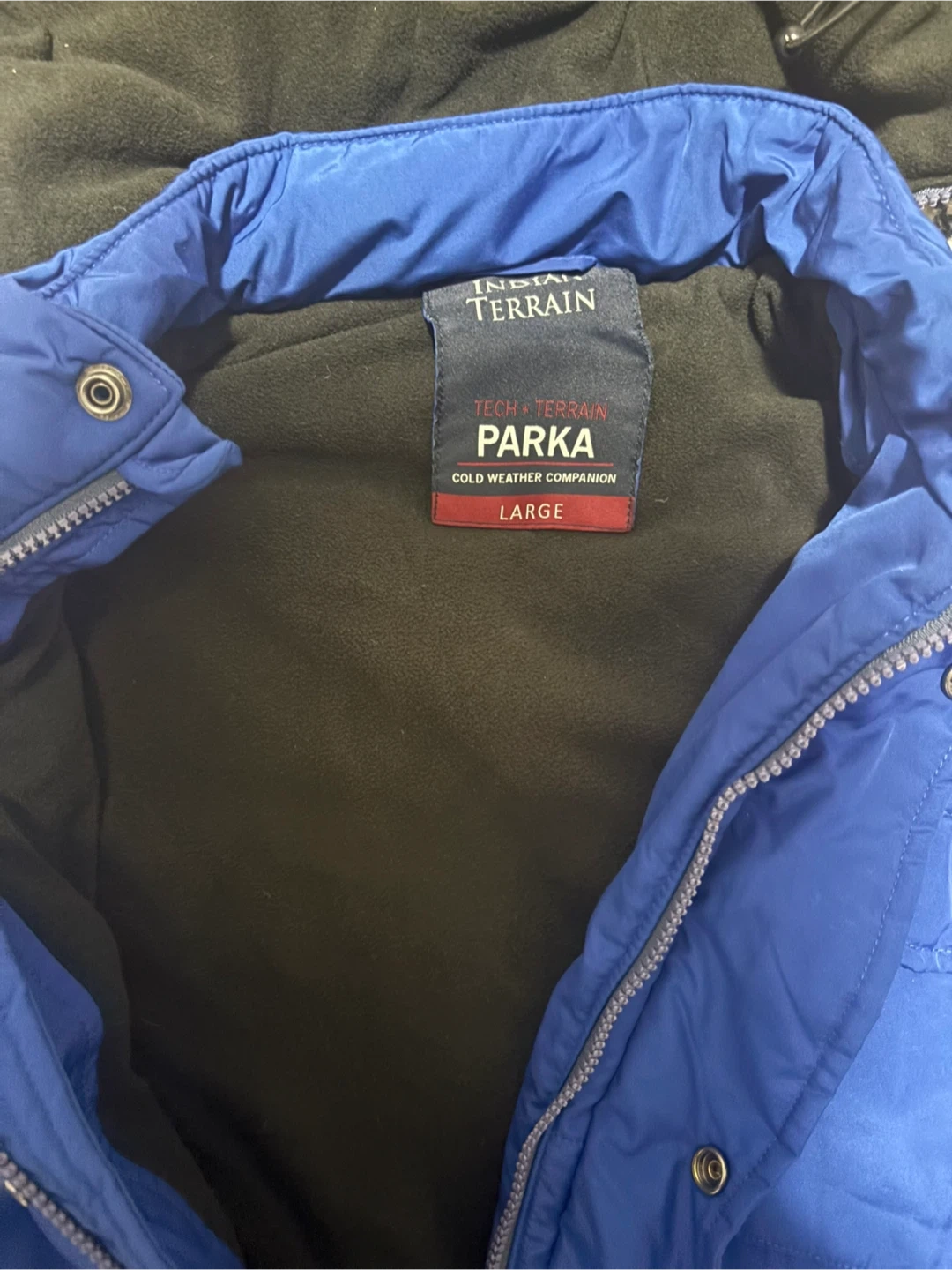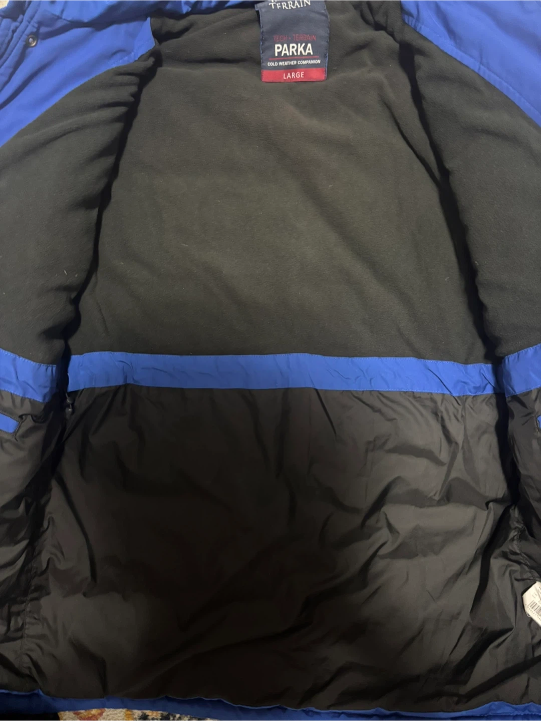 This blue Tech + Terrain parka is a cold weather companion. It's a size large with a fleece lining inside. Zips up the front.