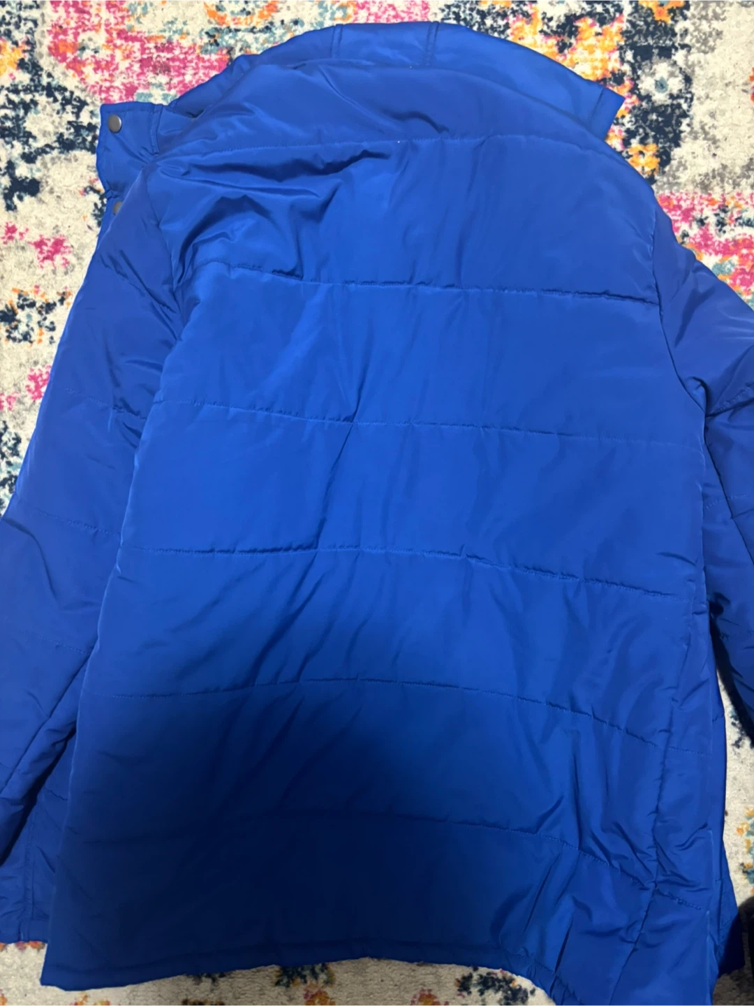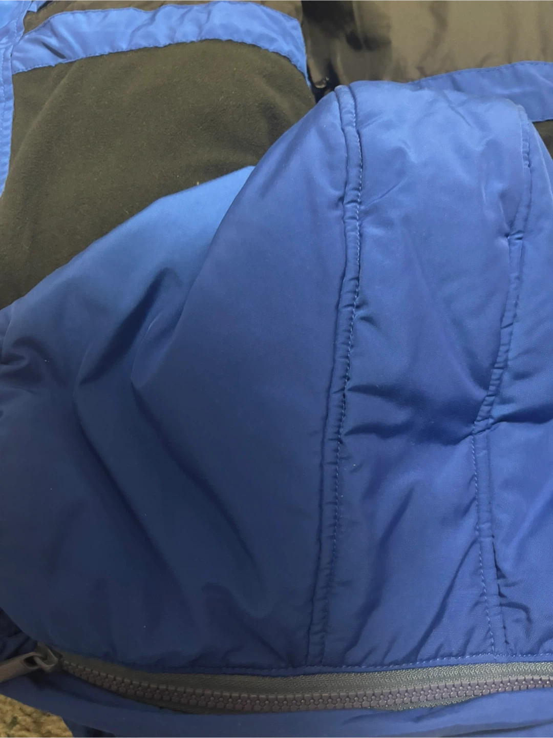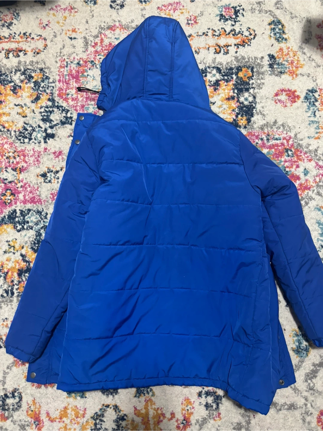 This blue Tech + Terrain parka is a cold weather companion. It's a size large with a fleece lining inside. Zips up the front.
