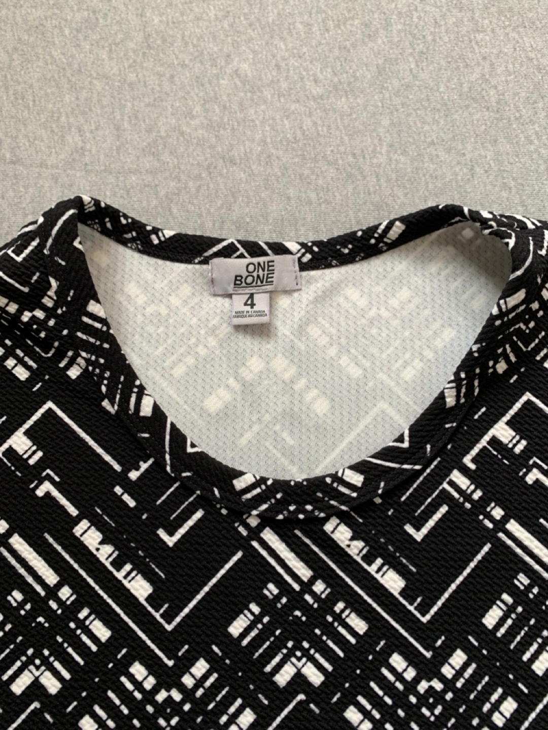 Black and white geometric print. Short sleeves. Round neckline. Relaxed fit.