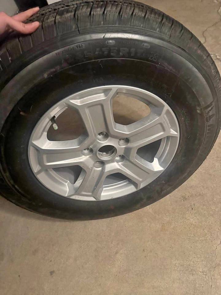 Brand new tire on OEM Jeep Wrangler rim, barely used (not even a full season). Rim is in perfect condition with no scratches, just missing center caps. Tire is 245/75R17 with full tread. Ready to install. Only one tire, can be used as replacement or spare.