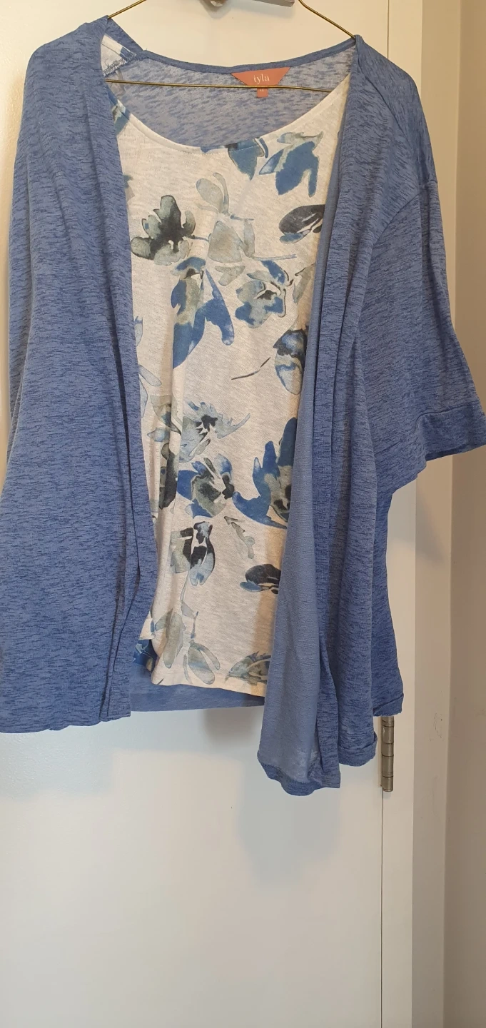 This Ryla top features a lovely blue and white floral print on the front. It's paired with a comfortable, solid blue open-front cardigan. The set offers a casual and stylish layered look.