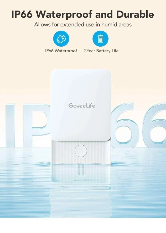 Smart GoveeLife water leak detector kit. Comes with 1 gateway and 4 sensors. Super easy to set up and monitors for water leaks remotely. Get alerts on your phone or email. Has 5-year battery life and a long 600m (1968ft) support distance. Connects using 2.4G Wi-Fi, LoRa, and Bluetooth. Can support up to 100 sensors. Keep your home safe from water damage!