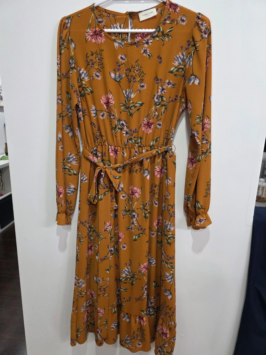 This stylish midi dress features a beautiful all-over floral print on a mustard-yellow background. It has long sleeves with elastic cuffs and a matching tie belt to cinch the waist. The flowy skirt adds a lovely silhouette. It's perfect for a casual outing or a nice dinner!