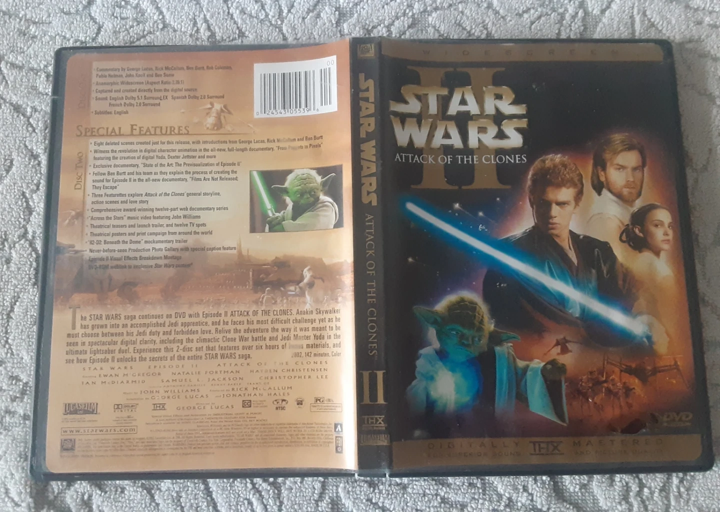 This is the Star Wars Episode II: Attack of the Clones DVD. It's a widescreen edition with digitally mastered THX sound and picture quality. Includes two discs with the main feature and special features.
