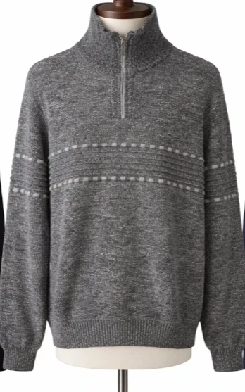 Quarter-zip pullover sweater with a short zipper at the top of the chest. Made in Iran.