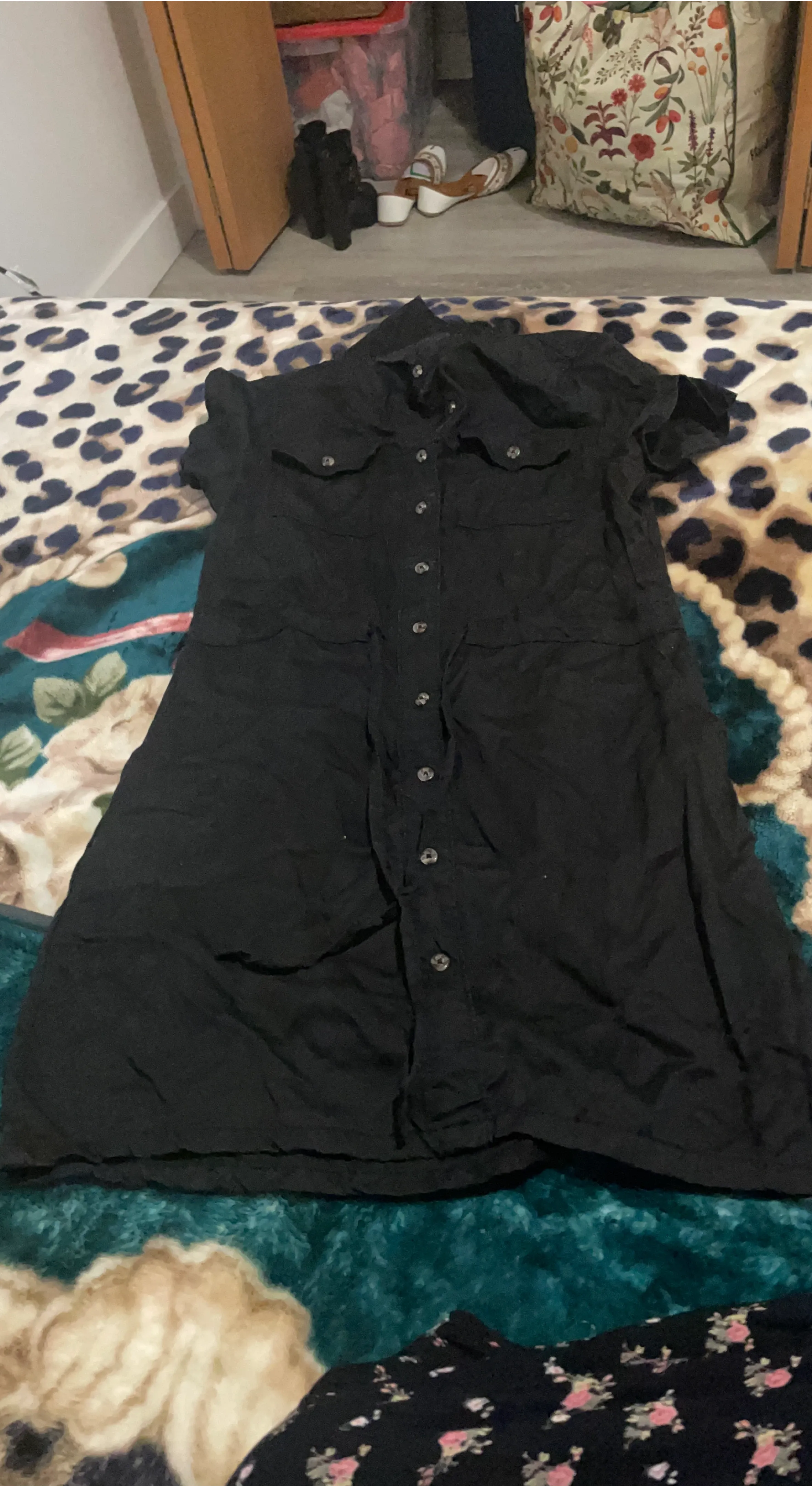 This is a black button-up shirt dress from Streetwear Society. It's a size small and made in Bangladesh. The material appears to be a cotton blend, offering a comfortable fit. This versatile dress can be worn casually or dressed up! I got this from Urban Planet and just wore it few times and never wore it again.