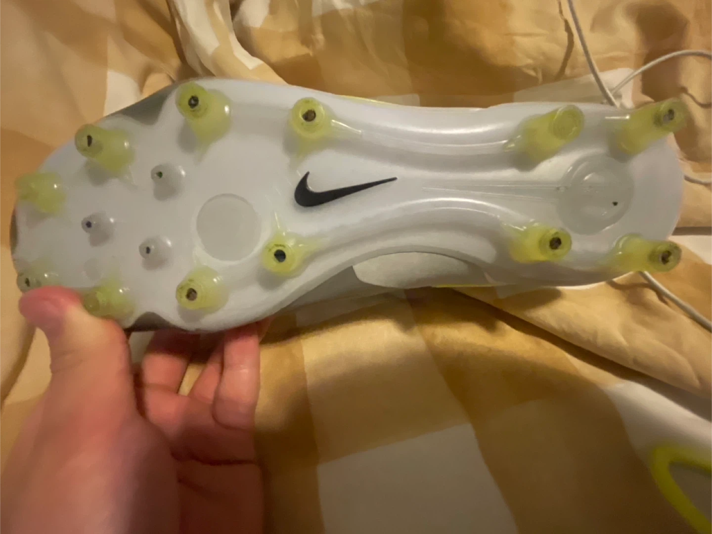 These Nike tiempo soccer cleats are designed for performance on the field. They feature a silver and black colourway with neon yellow accents. The Flyknit material provides a snug, sock-like fit. Cleats are built for firm ground.