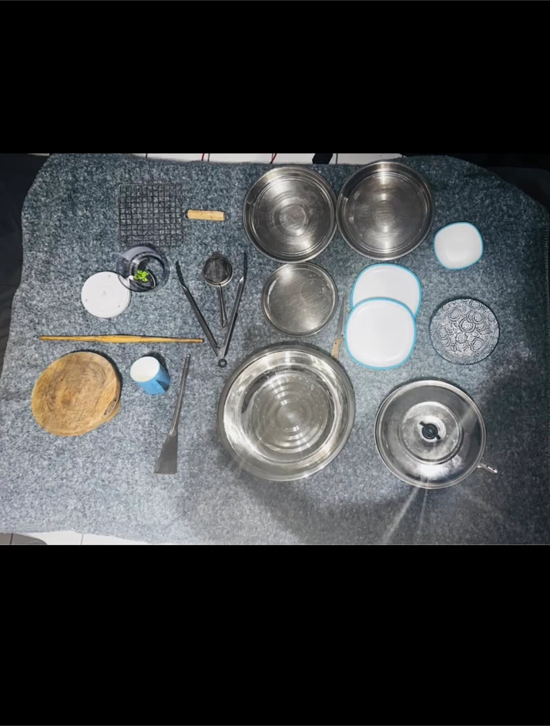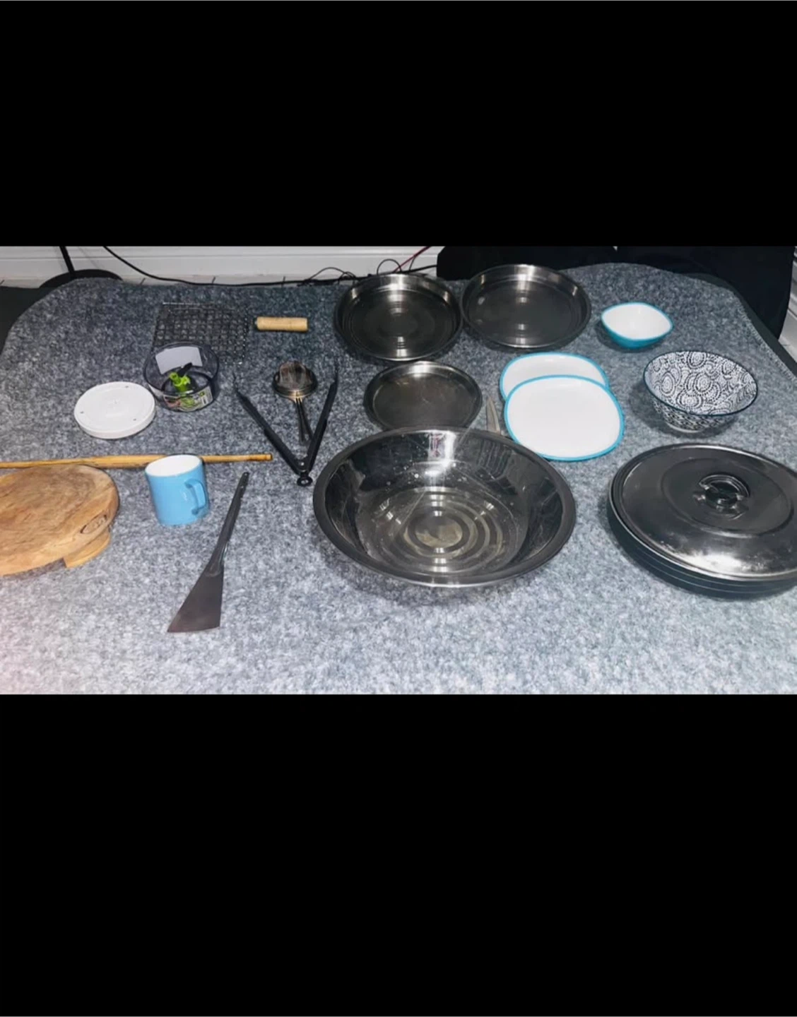 Selling a kitchen utensil set with various items. It includes bowls, plates, and cooking utensils. Good for someone setting up a kitchen!