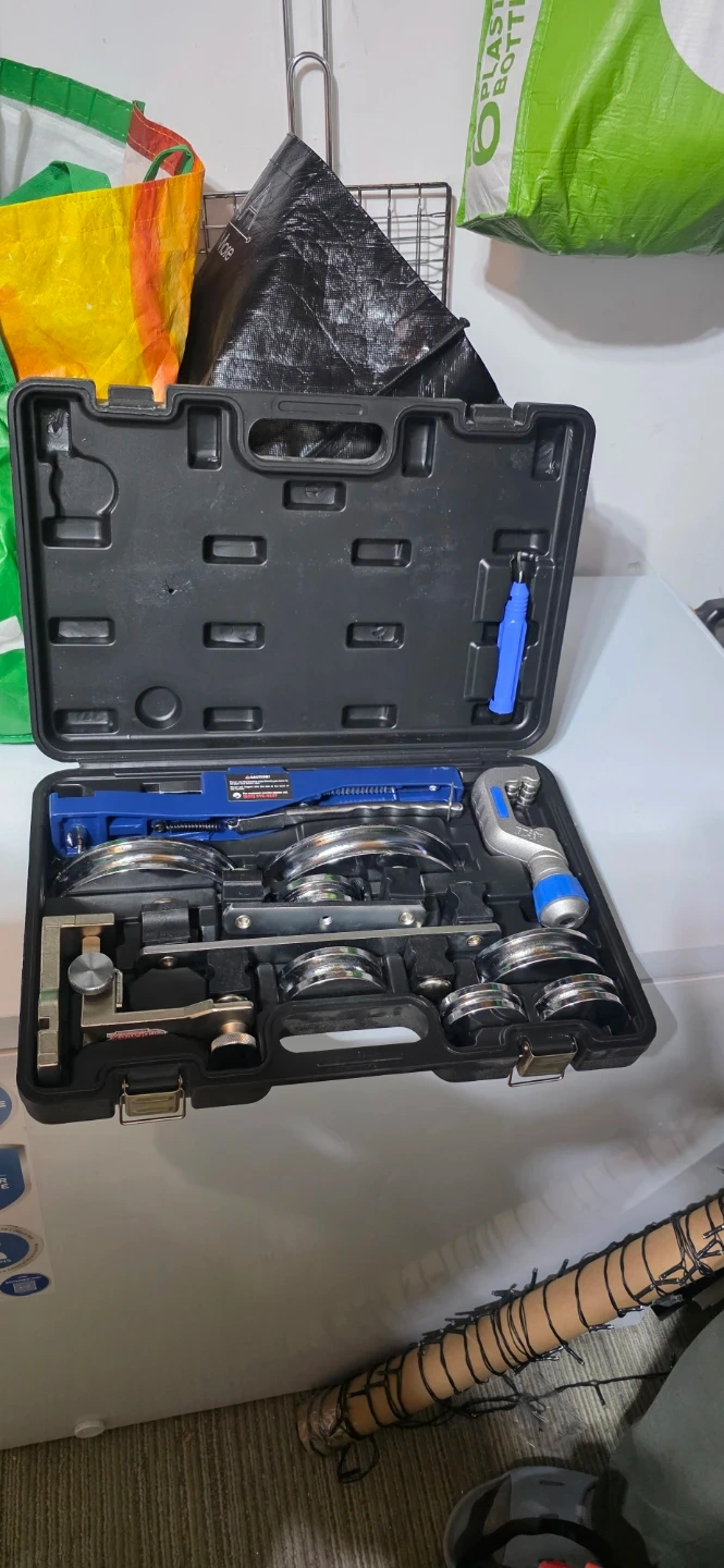 This is a Bravex compact bender kit. It includes various sizes for bending pipes. The kit comes in a durable carrying case. This tool is useful for plumbing and HVAC work.