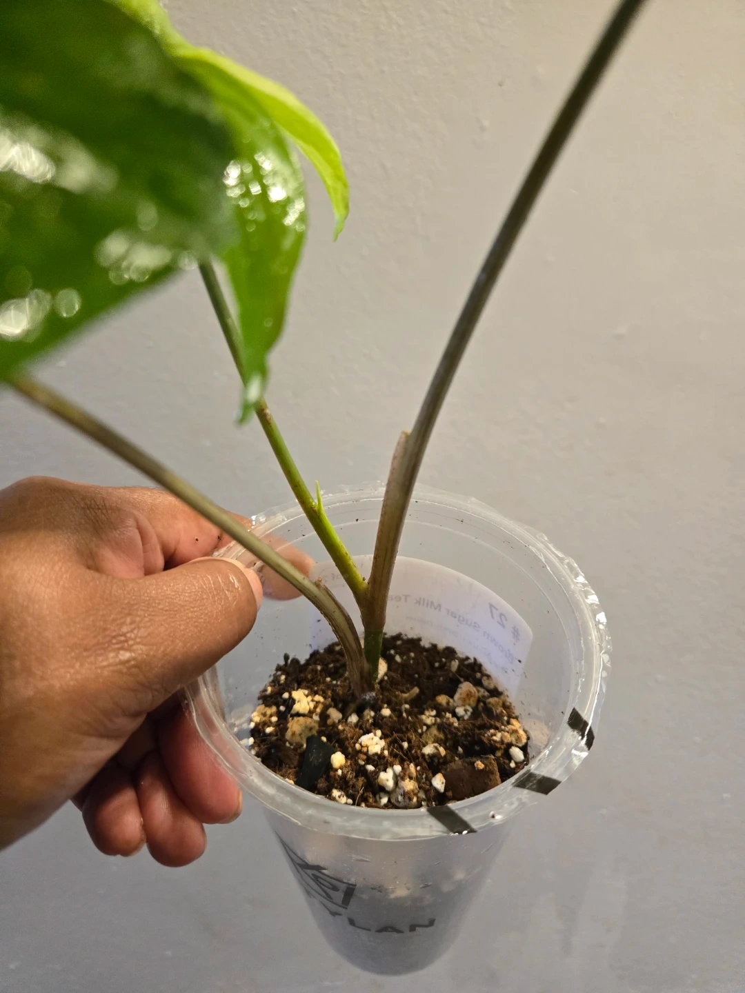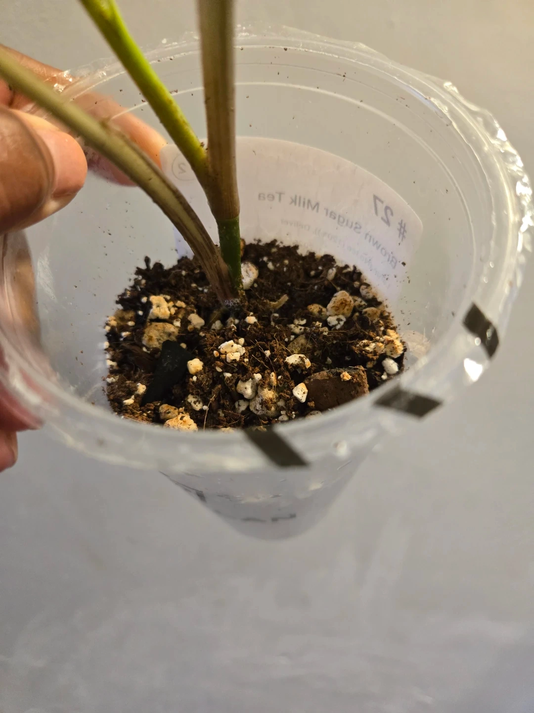 It's potted in a clear plastic cup with soil mix. ✨️🪴