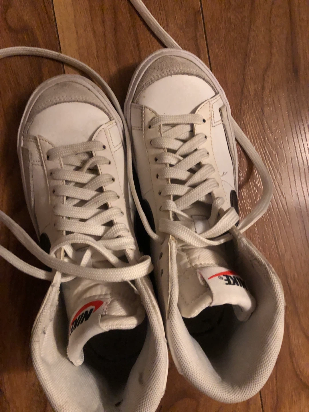 White and black Nike Blazer Mid '77 Vintage high-top sneakers. Classic design with suede accents. Lace-up closure for a secure fit.womens size 3 but is available to males aswell