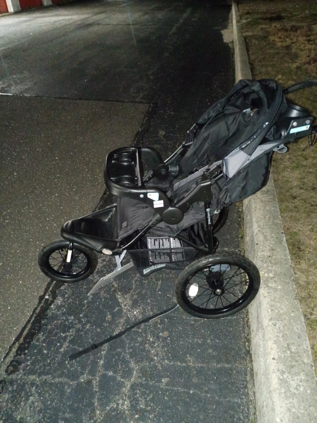 Baby Trend Expedition jogging stroller in black. It's a three-wheel stroller with large all-terrain tires. Includes a parent console with cup holders and a large storage basket. Canopy with peek-a-boo window.