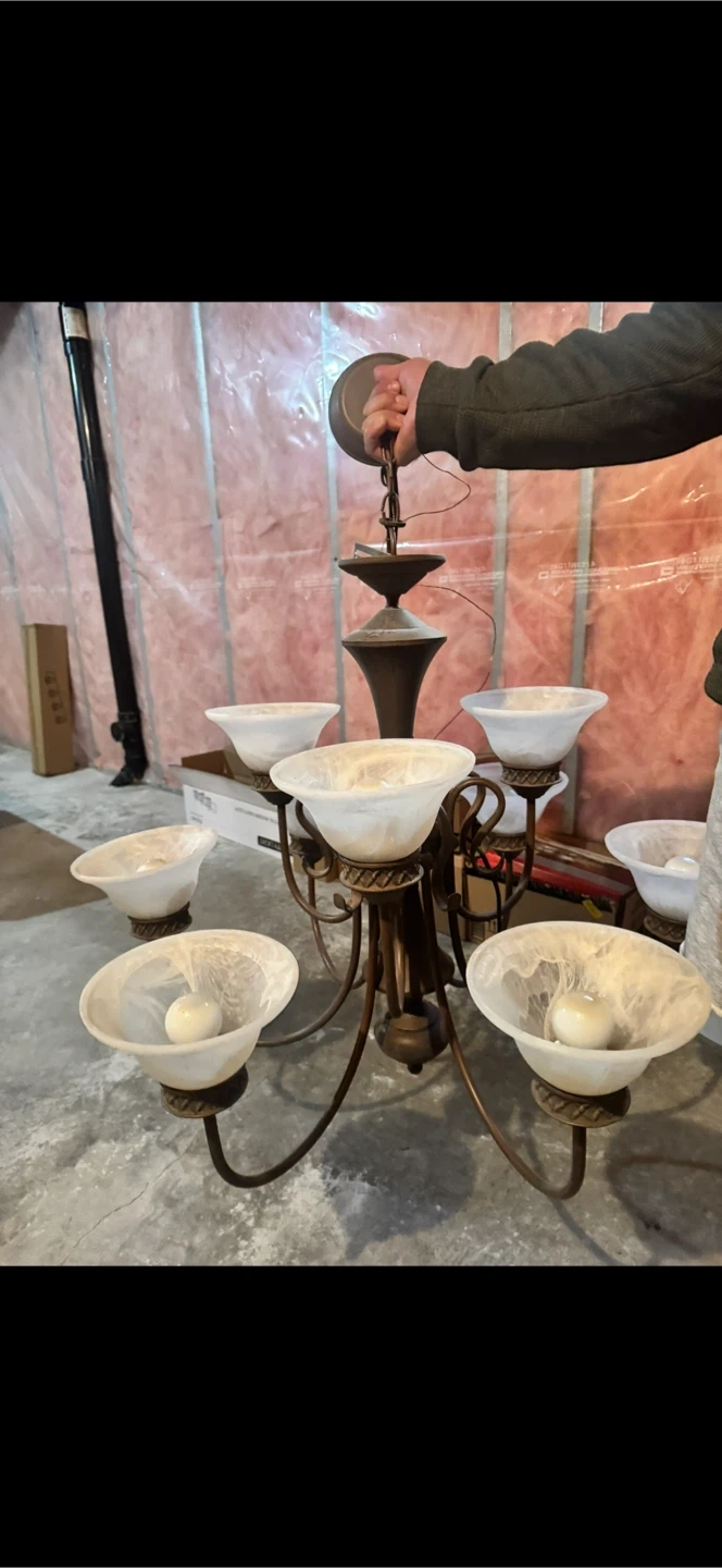 Selling a chandelier with 8 lights. It has a bronze-coloured metal frame and white glass shades. It would be a great addition to any dining room or living room