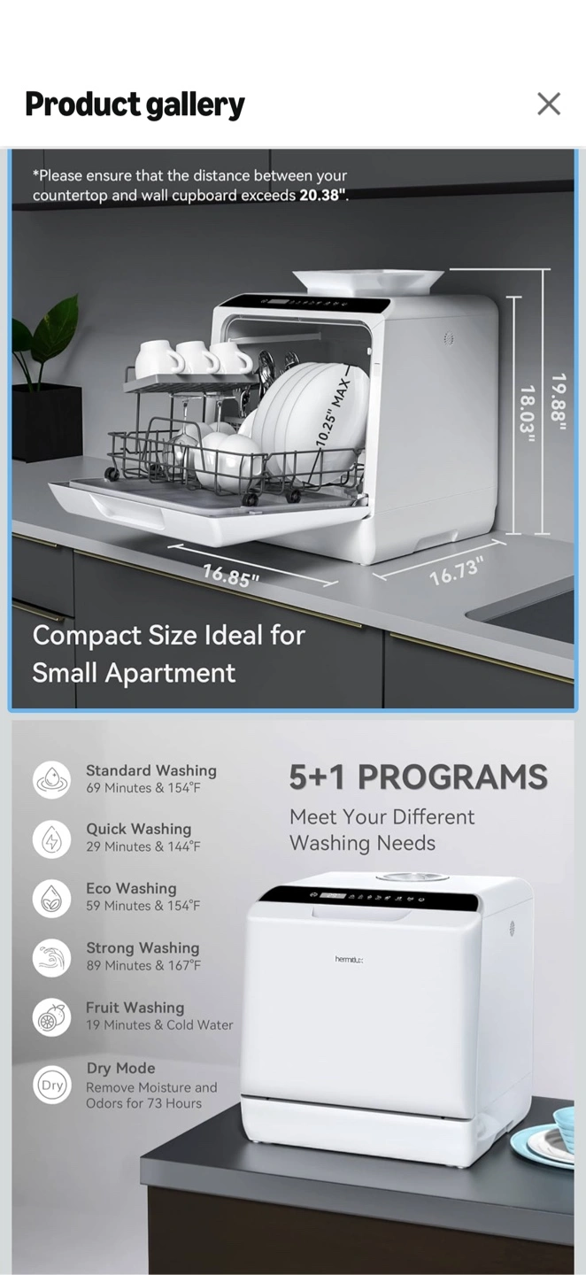 This Hermitlux countertop dishwasher offers 5+1 wash programs to meet your needs. It's a compact size, ideal for small apartments. It includes standard, quick, eco, strong, and fruit washing modes, plus a dry mode.