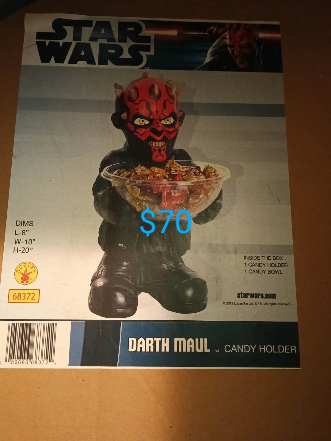 Selling a Star Wars Darth Maul candy holder! The dimensions are L-8", W-10", and H-20". Inside the box, you'll find one candy holder and one candy bowl. Great for any Star Wars fan! Asking $50