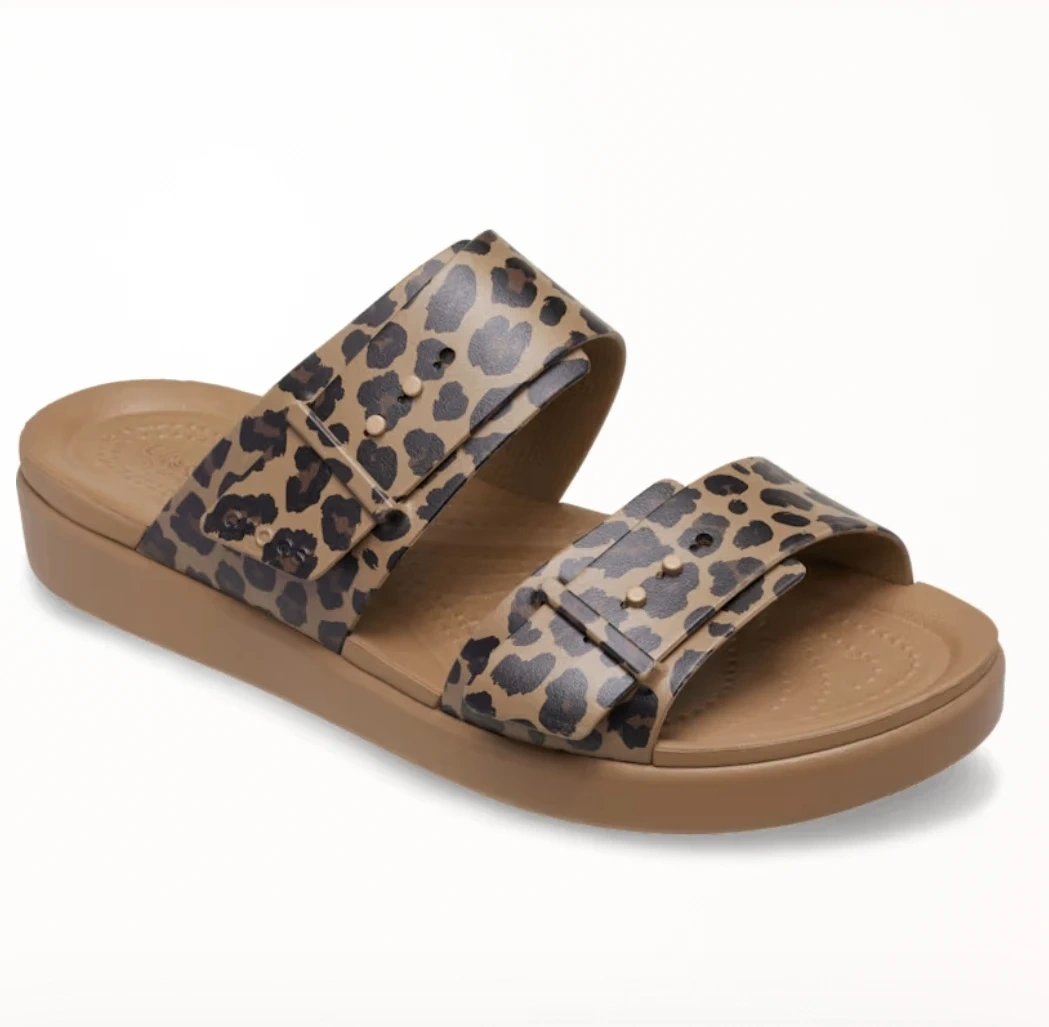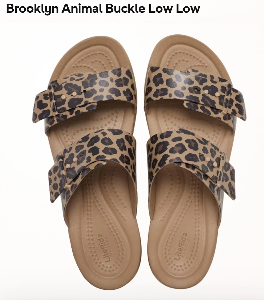 These Crocs Brooklyn Animal Buckle Low Low sandals feature a stylish leopard print. They have adjustable straps with buckles for a secure fit. LiteRide foam footbeds offer comfort.