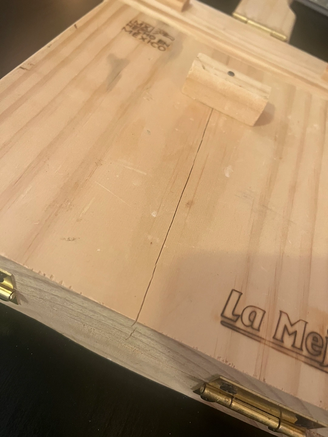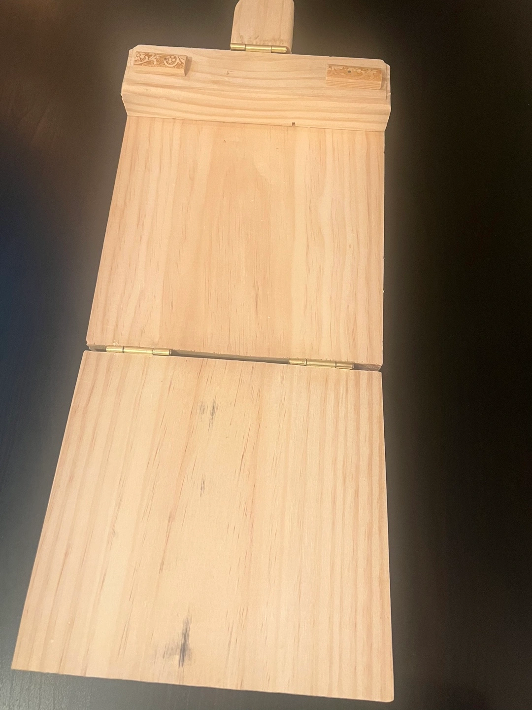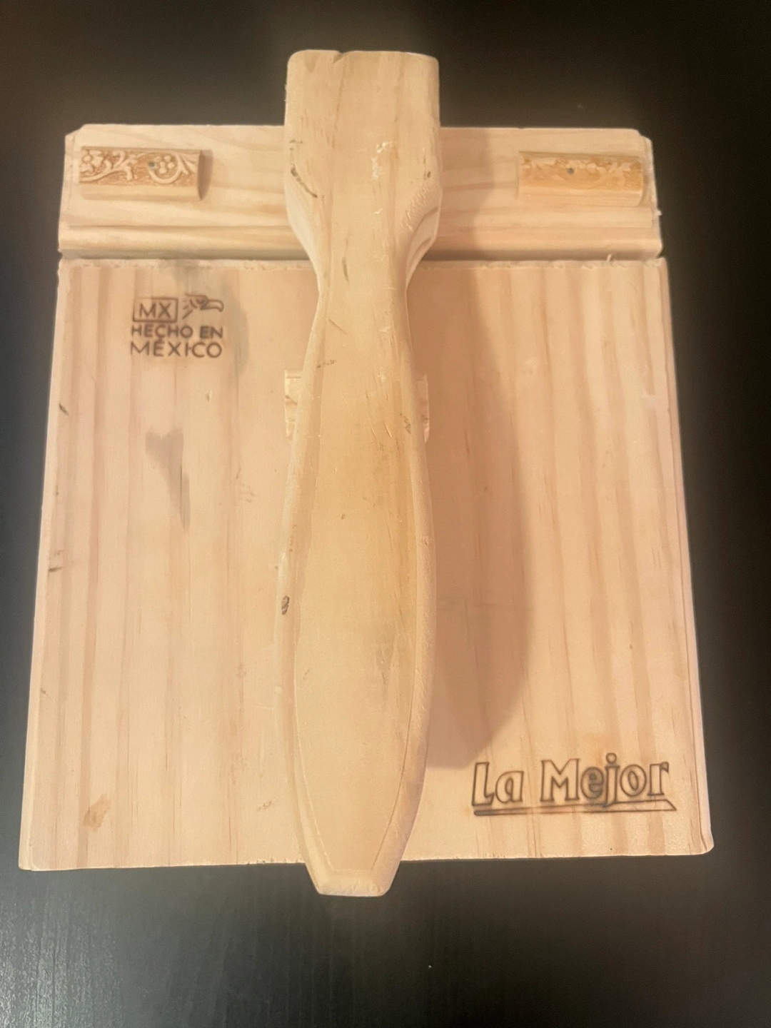 It has a wooden body and handle (it’s heavy) The press folds over for storage. It is in great shape (minor crack shoes in pics) and perfect for making fresh tortillas at home.