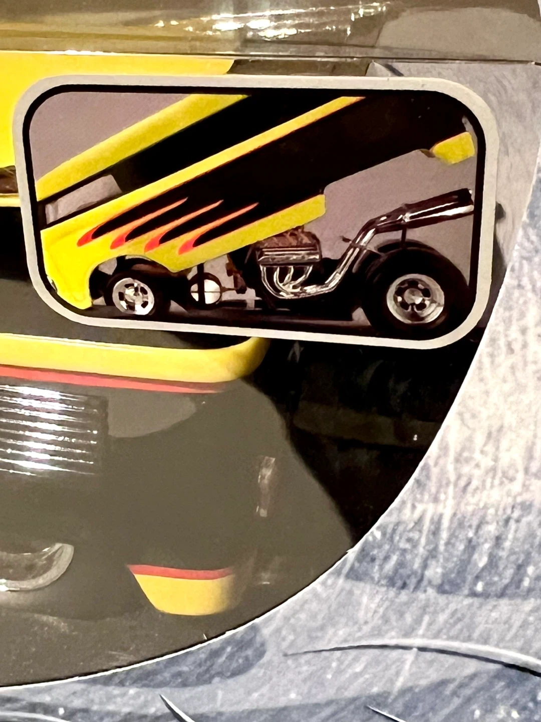 This is a Hot Wheels Customized VW Drag Bus. It features a bright yellow and black paint scheme with flame decals. It's a 1:18 scale collectible. Recommended for ages 14 and up.