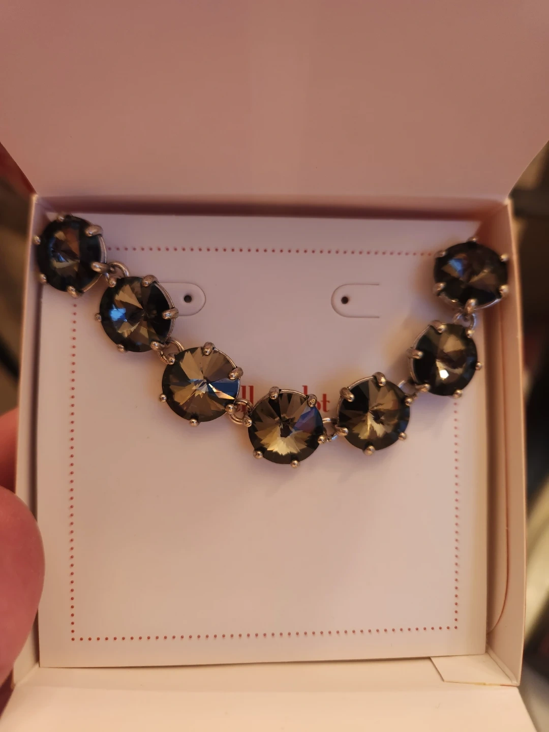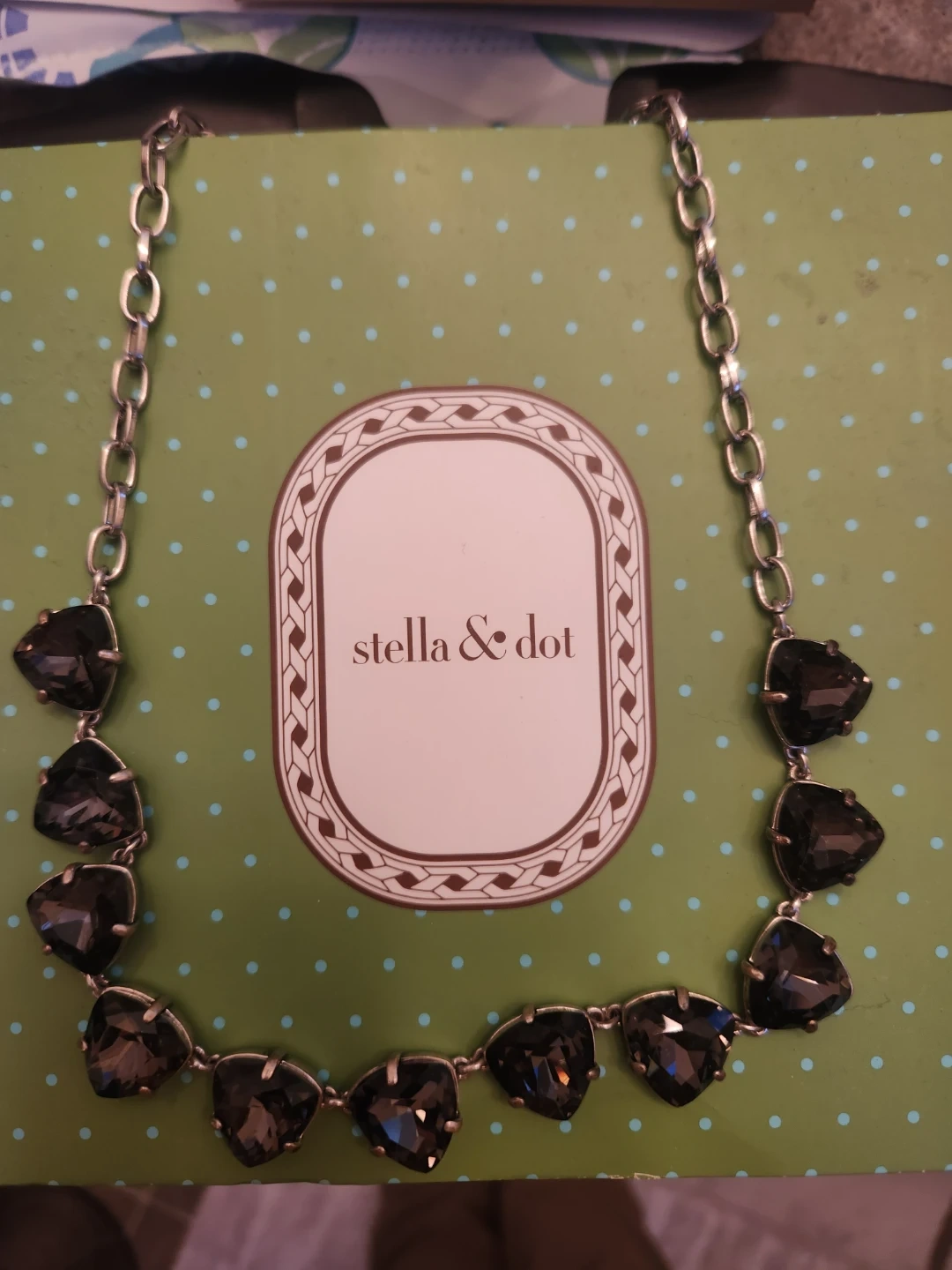 This Stella & Dot necklace features a silver-tone chain adorned with dark, faceted gems. The necklace is designed with a series of shimmering triangular stones that catch the light beautifully. The bracelet has beautiful round stones with the same shimmering brilliance!