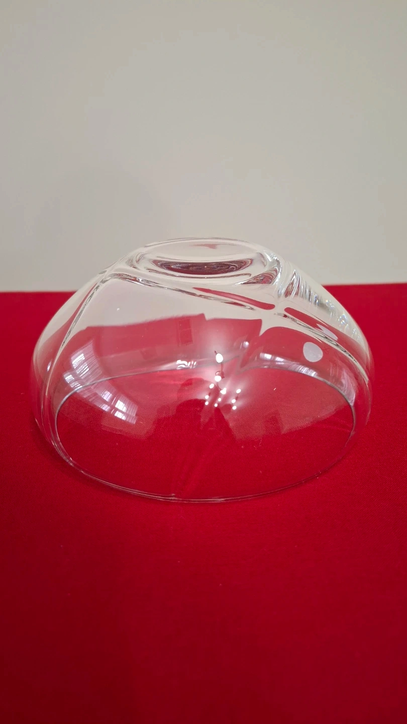 This is a clear glass serving bowl from Zwiesel Glas. It's part of the Caroline collection. The bowl has a textured swirl pattern on the exterior. Comes in original box.
