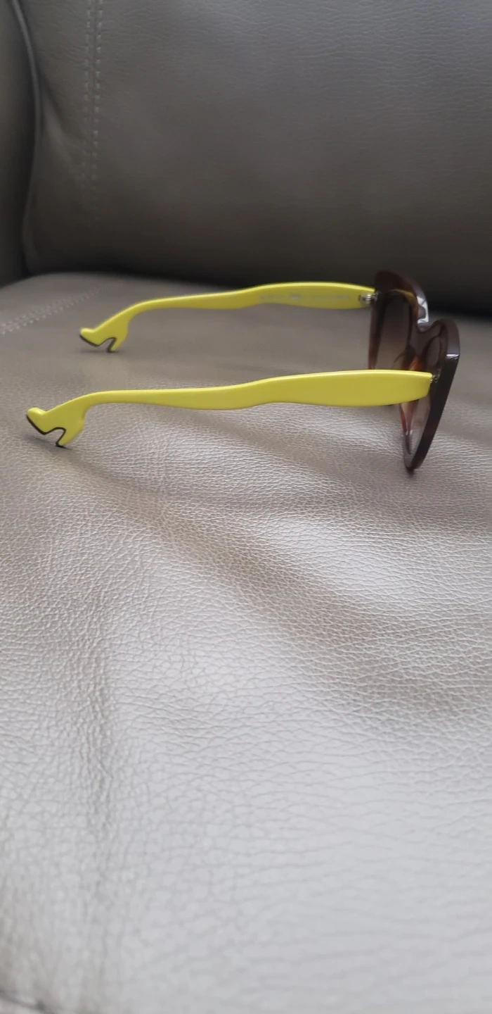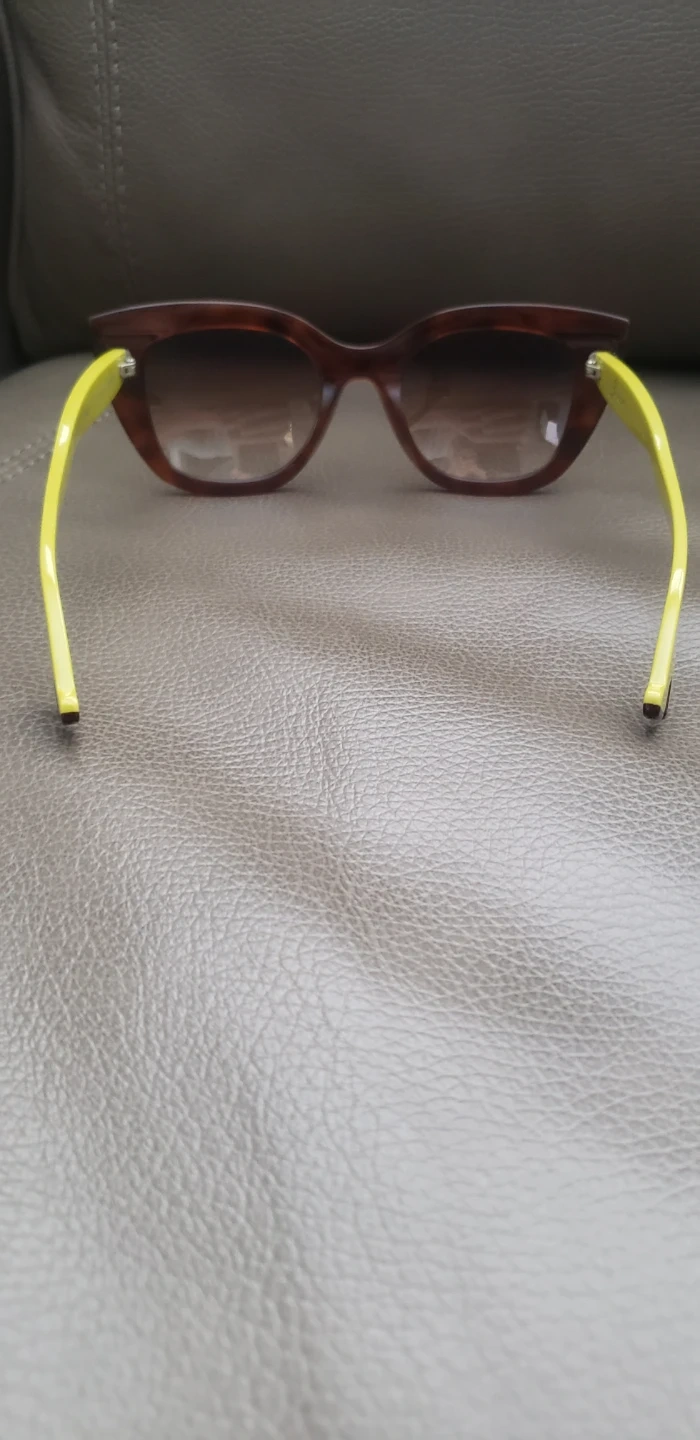 These Pre-owned Face A Face BOCCA Joy 1 Cat Eye sunglasses 52-22-143 Col 0530 Hand Made in Italy feature a trendy tortoiseshell frame with bright yellow arms. The lenses offer a gradient tint for stylish sun protection. A unique accent at the end of each arm adds a playful touch!
