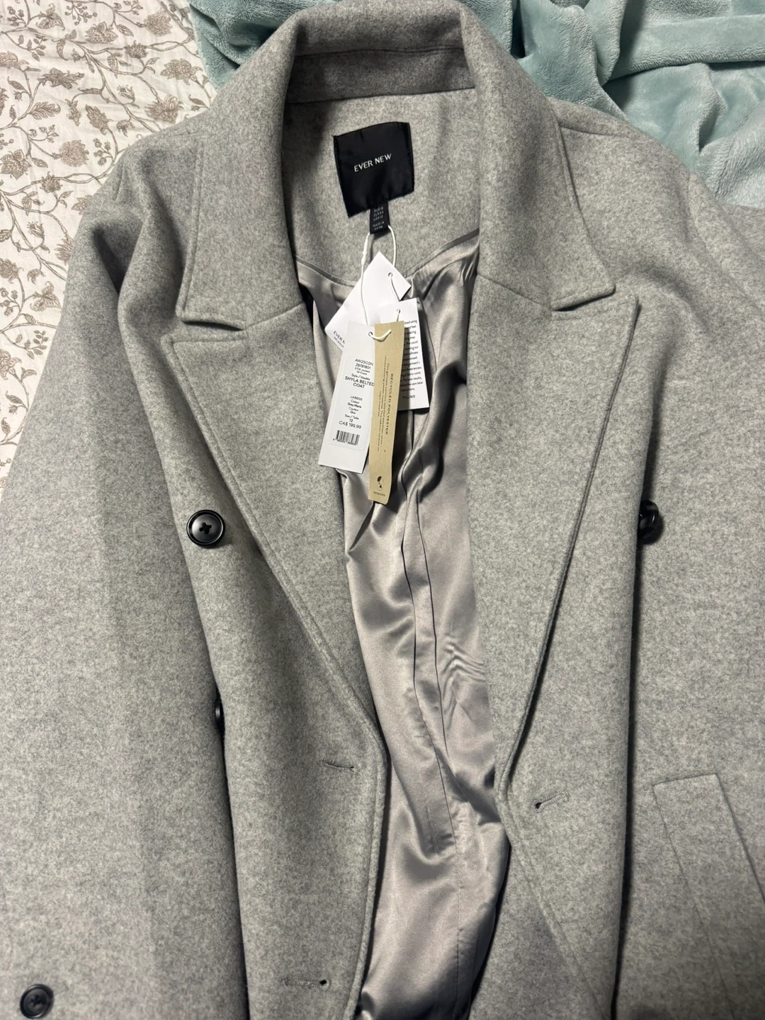 This is an Ever New double-breasted belted coat in grey. It's fully lined with a satin-like material and features two front buttons. The coat is a size 12. Its classic design makes it suitable for various occasions. NEW WITH TAGS