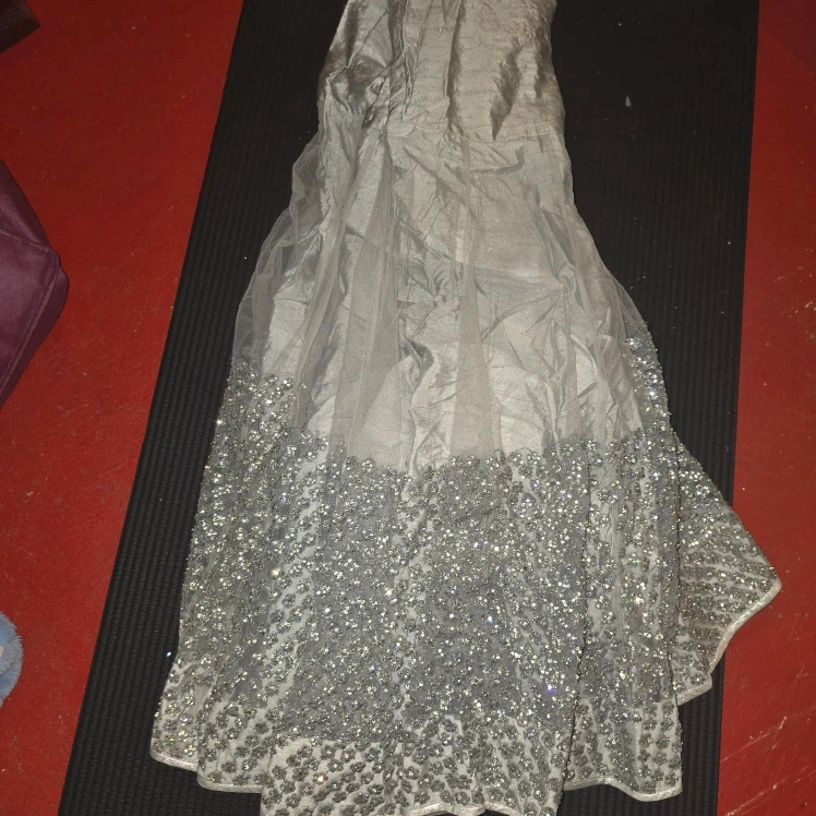 This is a beautiful silver dress with intricate embellishments. It would be perfect for a special occasion! The dress features detailed beadwork and a flattering silhouette. The material is lightweight and comfortable, making it easy to wear for extended periods. It's in great condition and ready for a new home. Got it off of fb marketplace and never wore it. Comes with top, shawl, and pants.