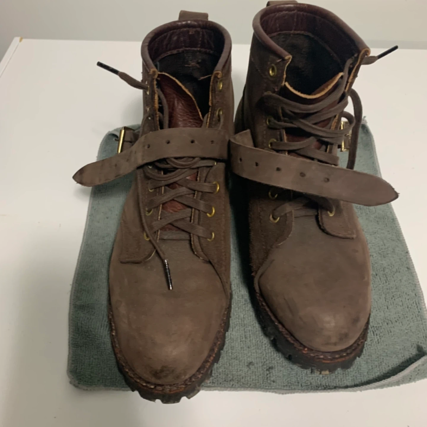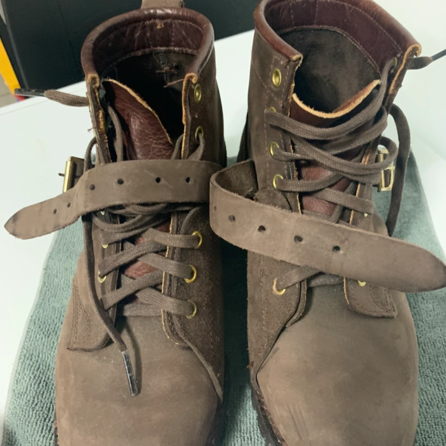 A pair of brown leather lace-up boots. These boots feature a rugged design with a side strap and buckle closure. The material appears to be a mix of smooth and suede leather.