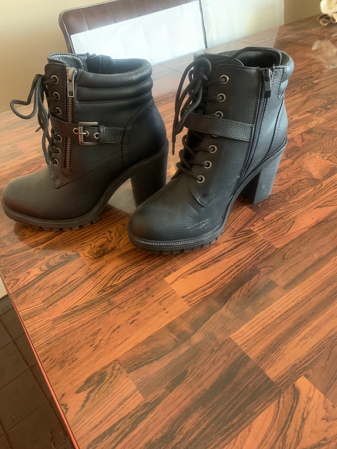 Stylish black faux leather combat boots with a chunky heel and side zipper. Features lace-up front and adjustable buckle strap. Perfect for adding an edgy touch to any outfit!