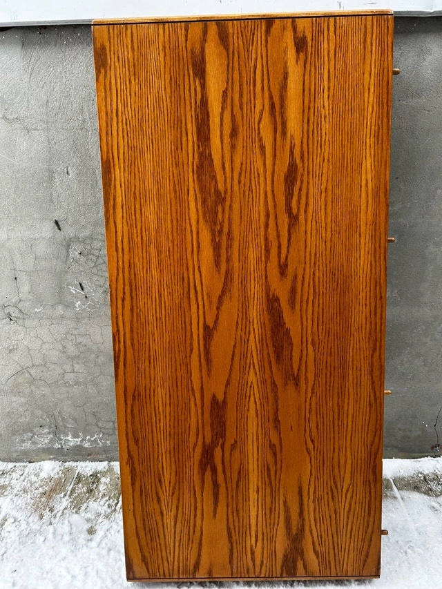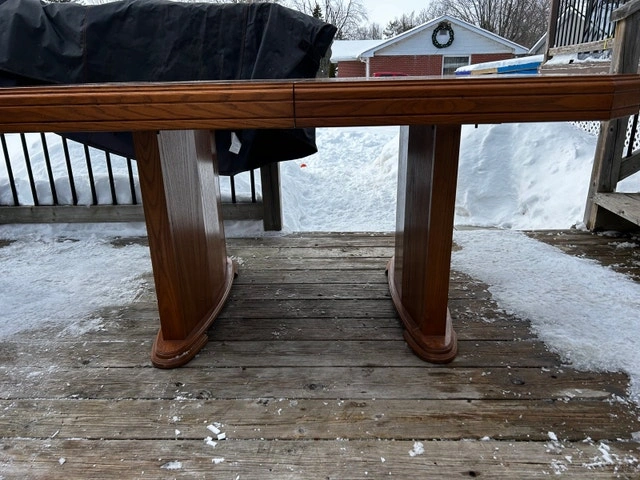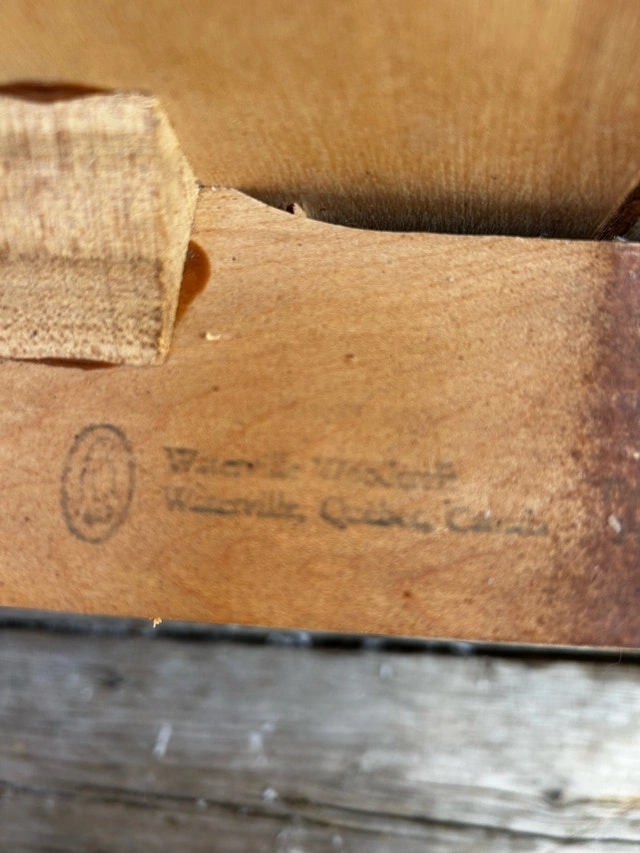 Beautiful, high-quality dining table from the renowned Waterville Furniture company (Waterville, Quebec). This is a solid, well-crafted Canadian piece built to last. Features: - Brand: Authentic Waterville Furniture (Stamp on underside) - Material: Solid Oak / Oak Veneer with a warm, natural finish - Versatile Design: Features a sturdy double-pedestal base - Extendable: Includes the original extension leaf to easily accommodate more guests. Cash accepted.