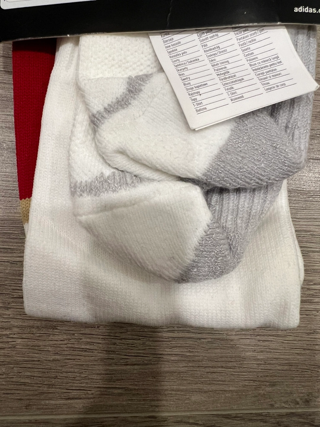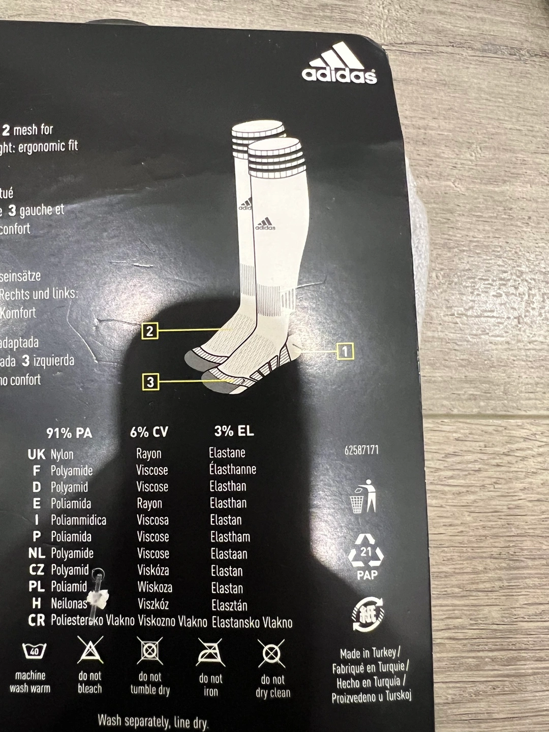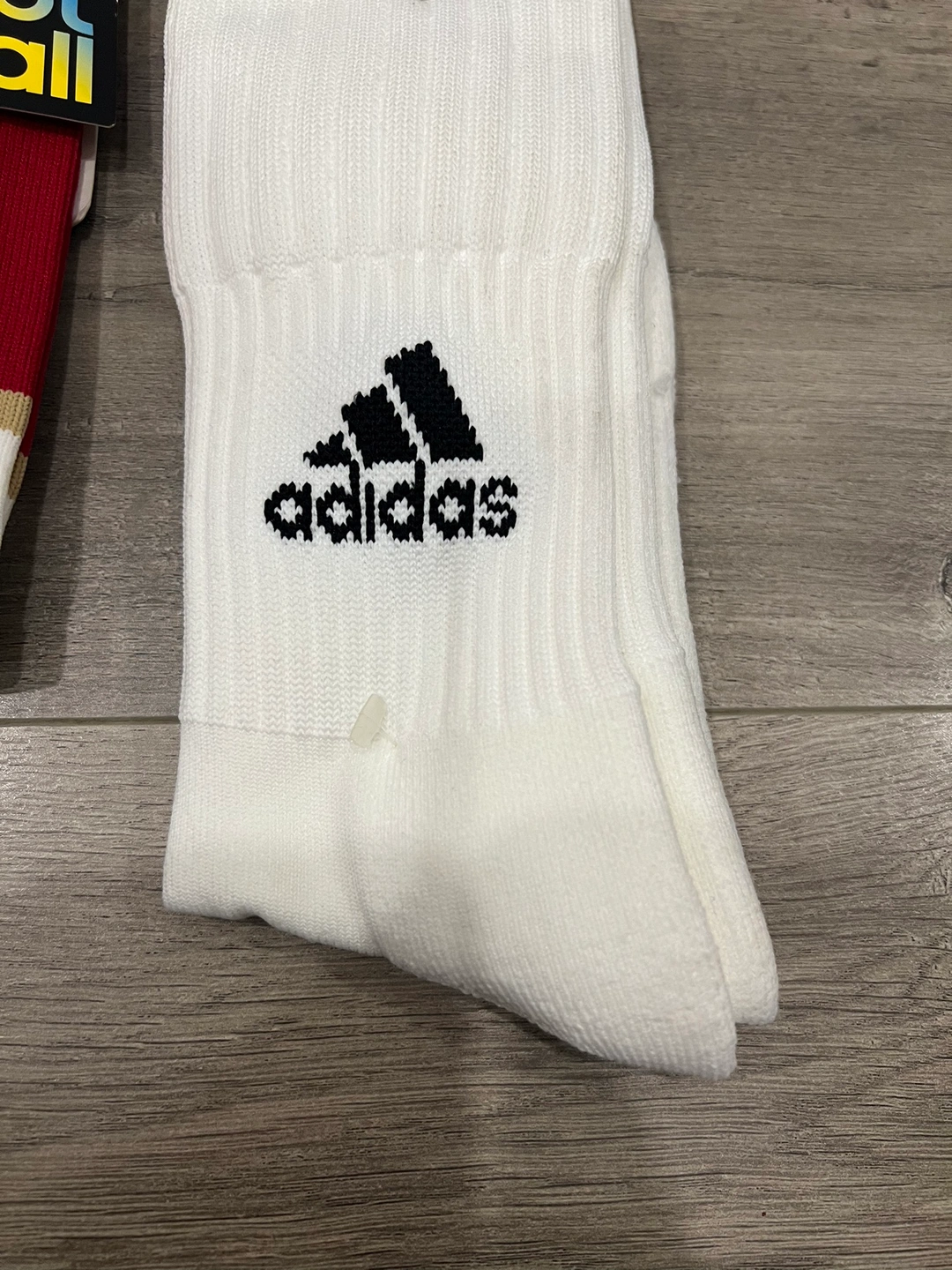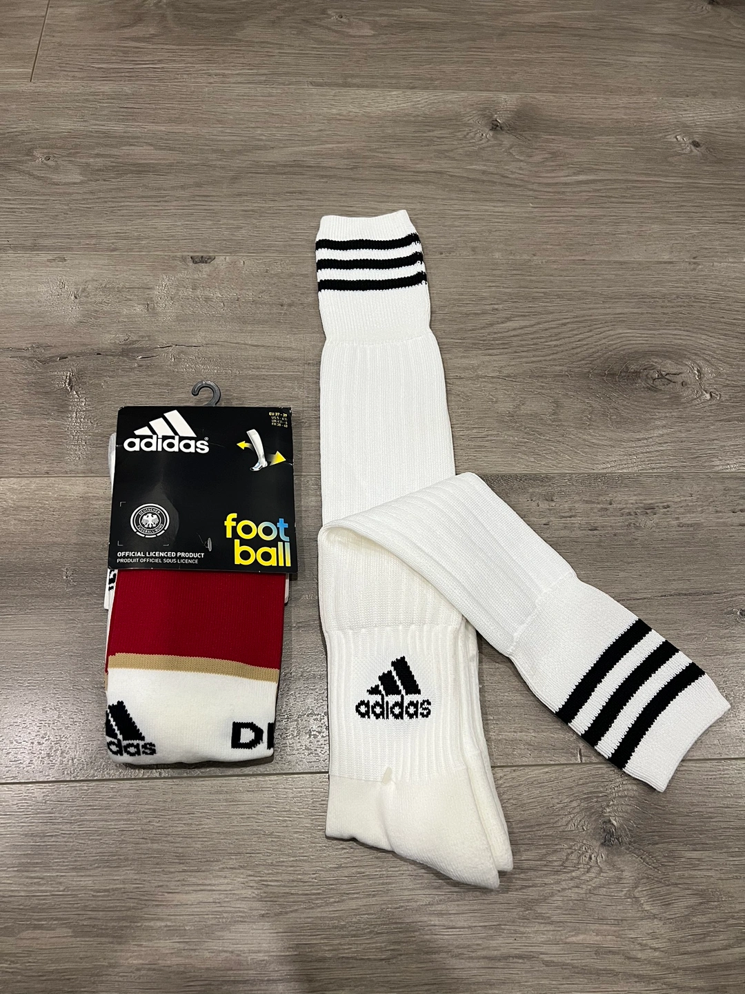 White Adidas football socks with black stripes and logo. The socks are in packaging with an additional pair of socks featuring the German national football team colours.