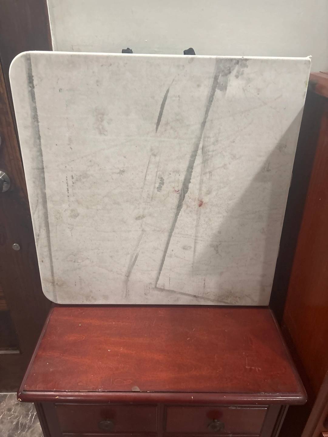 Lightweight, foldable table. Grey plastic top and metal legs. Some minor markings on the surface. Great for indoor or outdoor use.