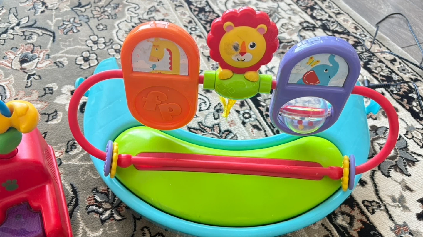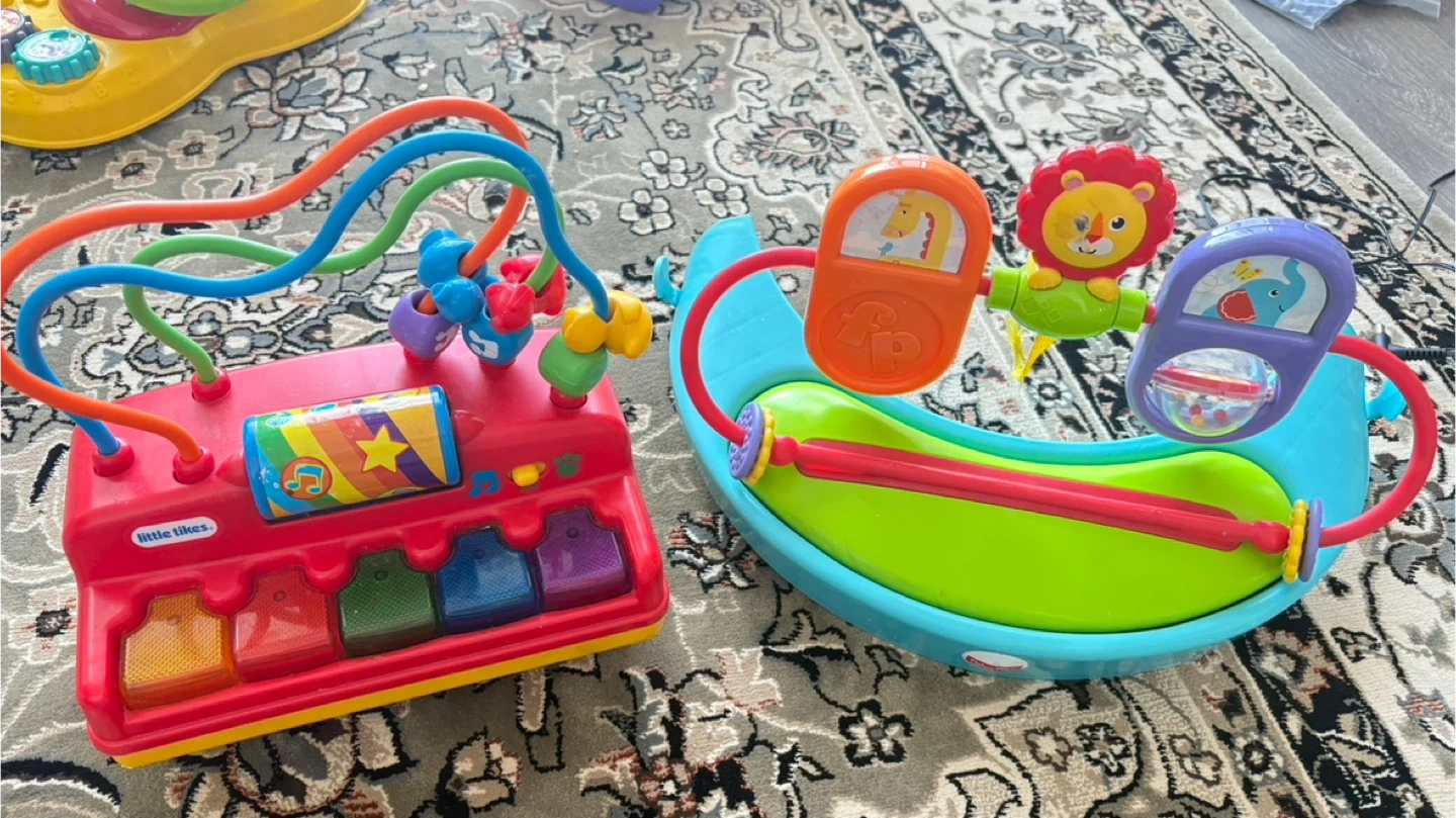 Bundle includes a Little Tikes red piano with beads and a Fisher-Price rocking toy with animal images. Great for little ones learning fine motor skills!