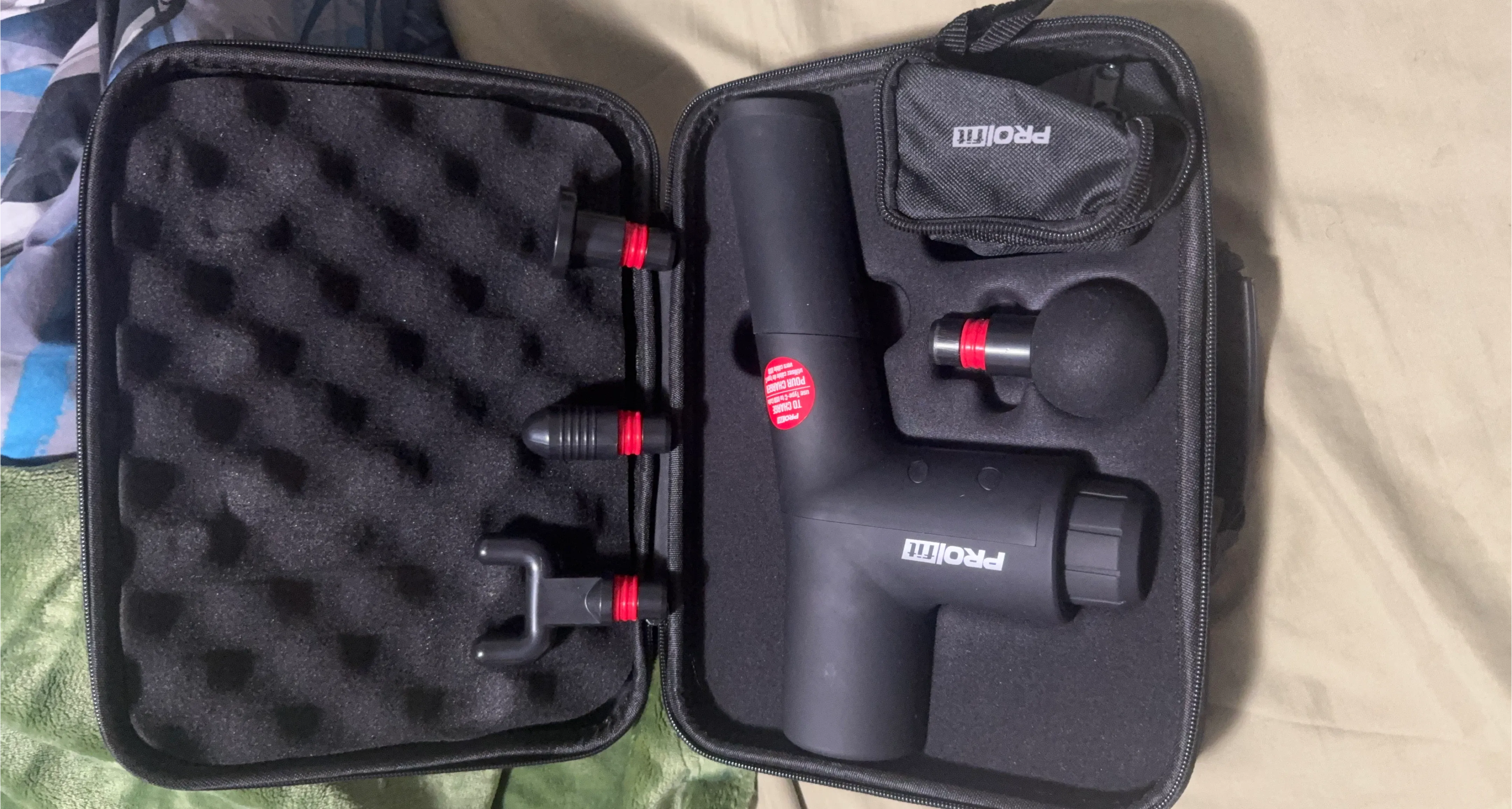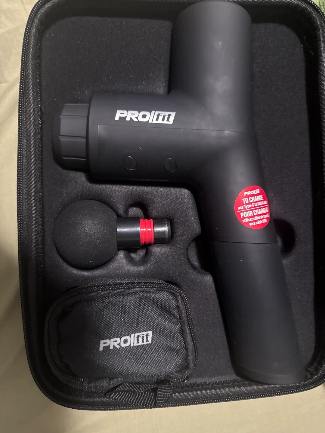 PROFIT massage gun comes with a case and multiple attachments for different muscle groups. It's designed for muscle recovery and relaxation. The kit includes the gun, charger, and various heads for targeted massage.